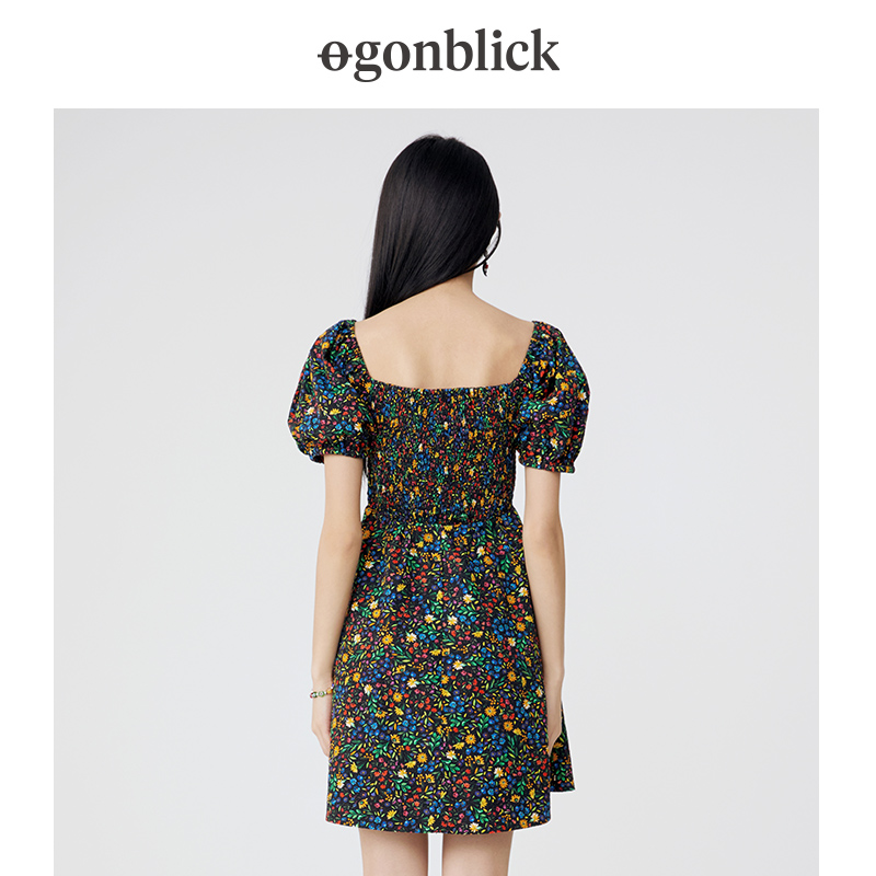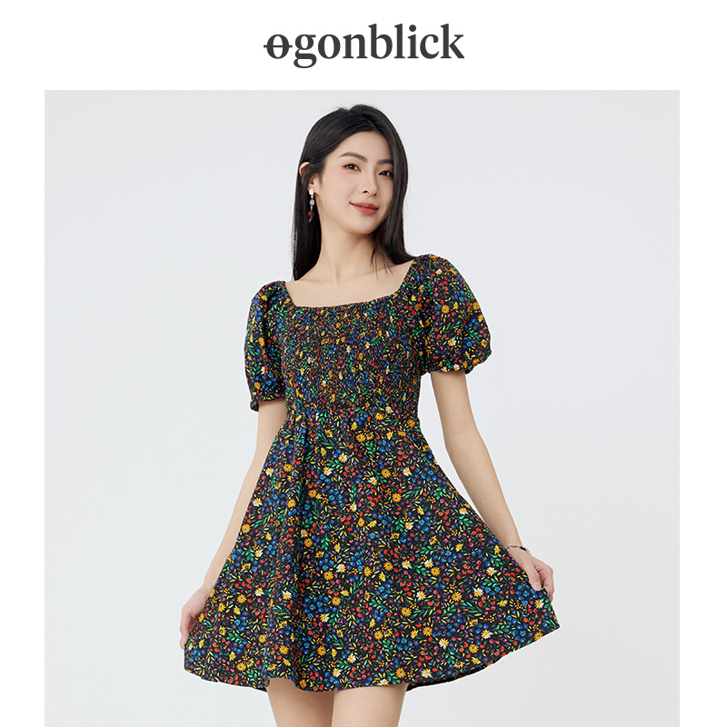北欧时刻方领碎花连衣裙2025年新款 收腰显瘦小个子A字裙 纯棉法式