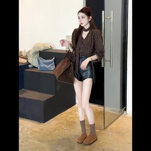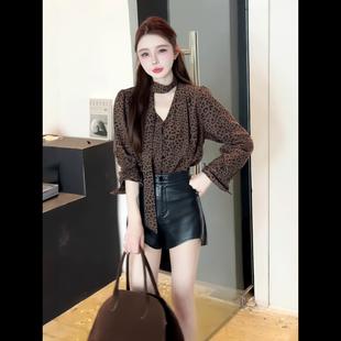 防晒上衣 女早秋性感御姐轻熟风衬衣小众薄款 豹纹v领长袖 雪纺衬衫