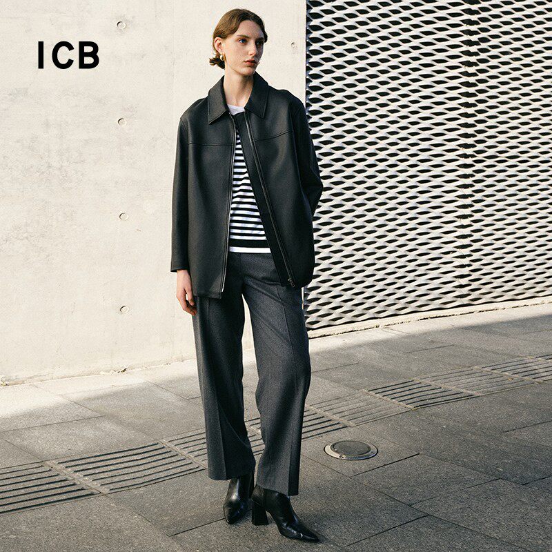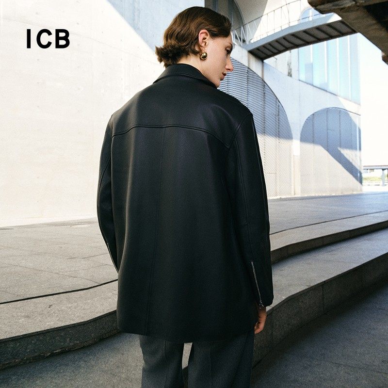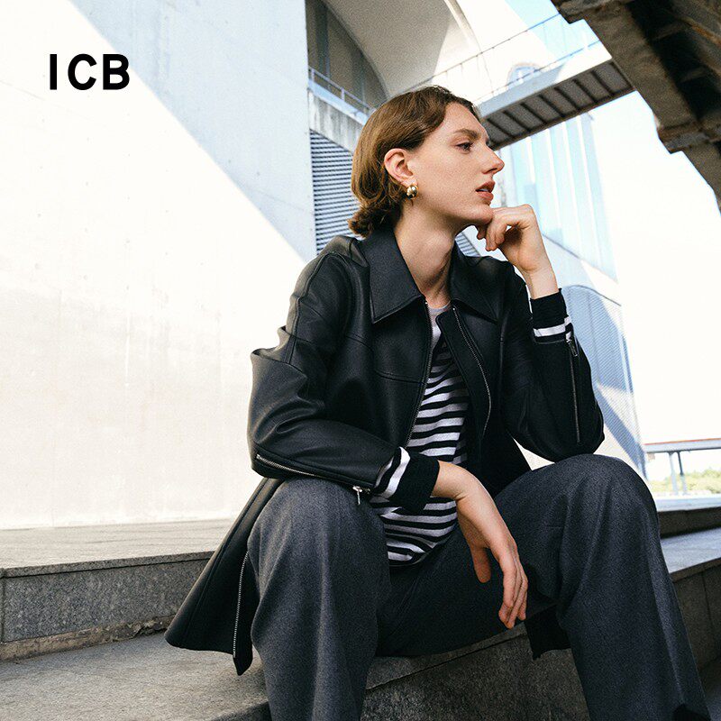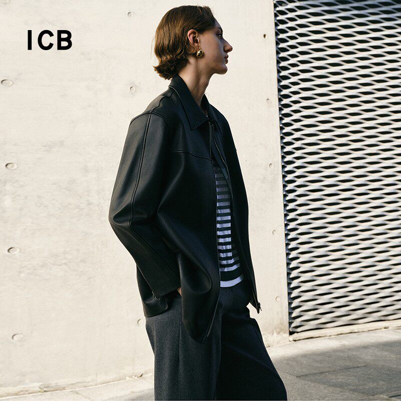 羊革方领皮衣外套拉链皮夹克上衣商场同款 ICB日系春季 通勤宽松版