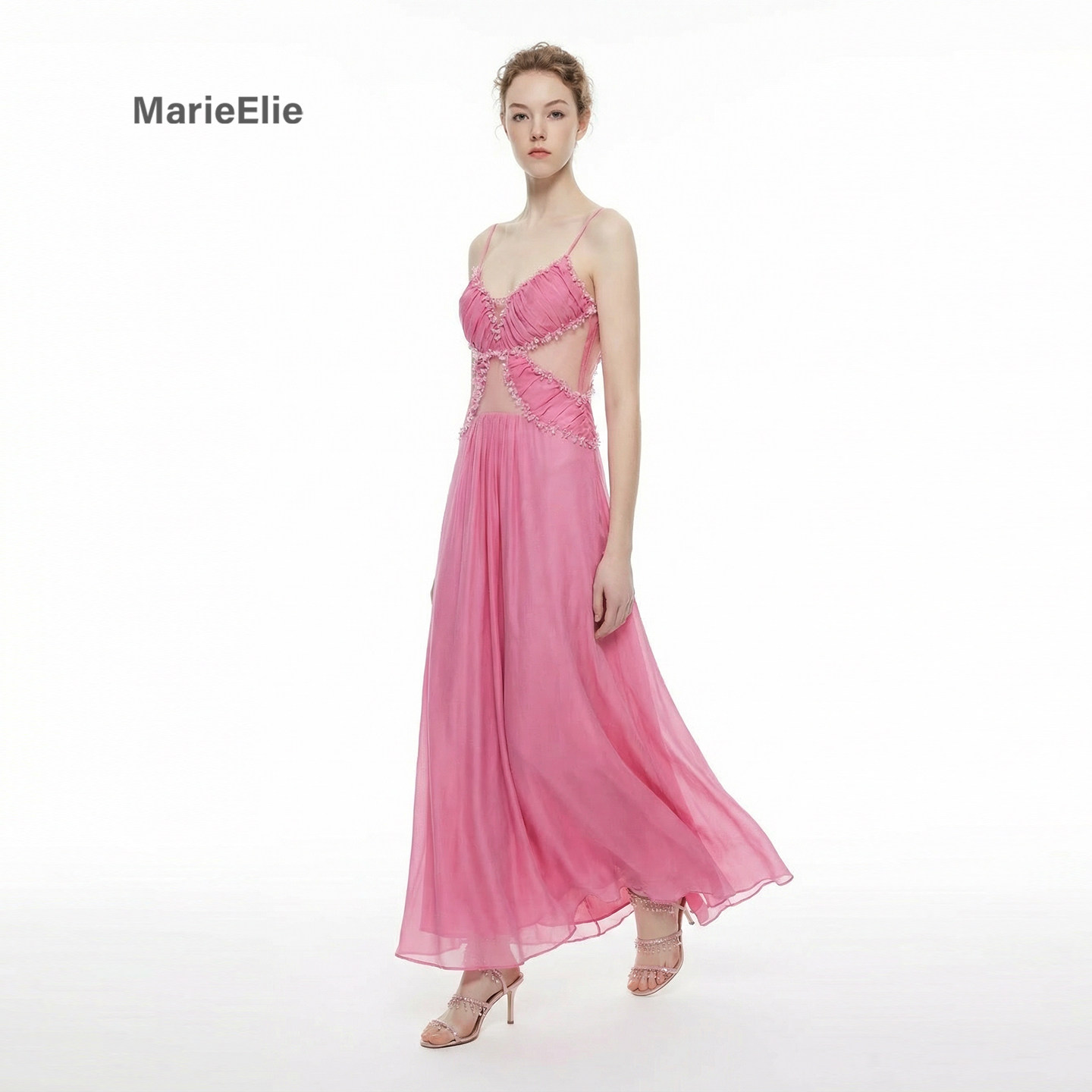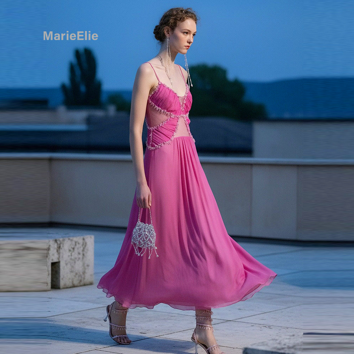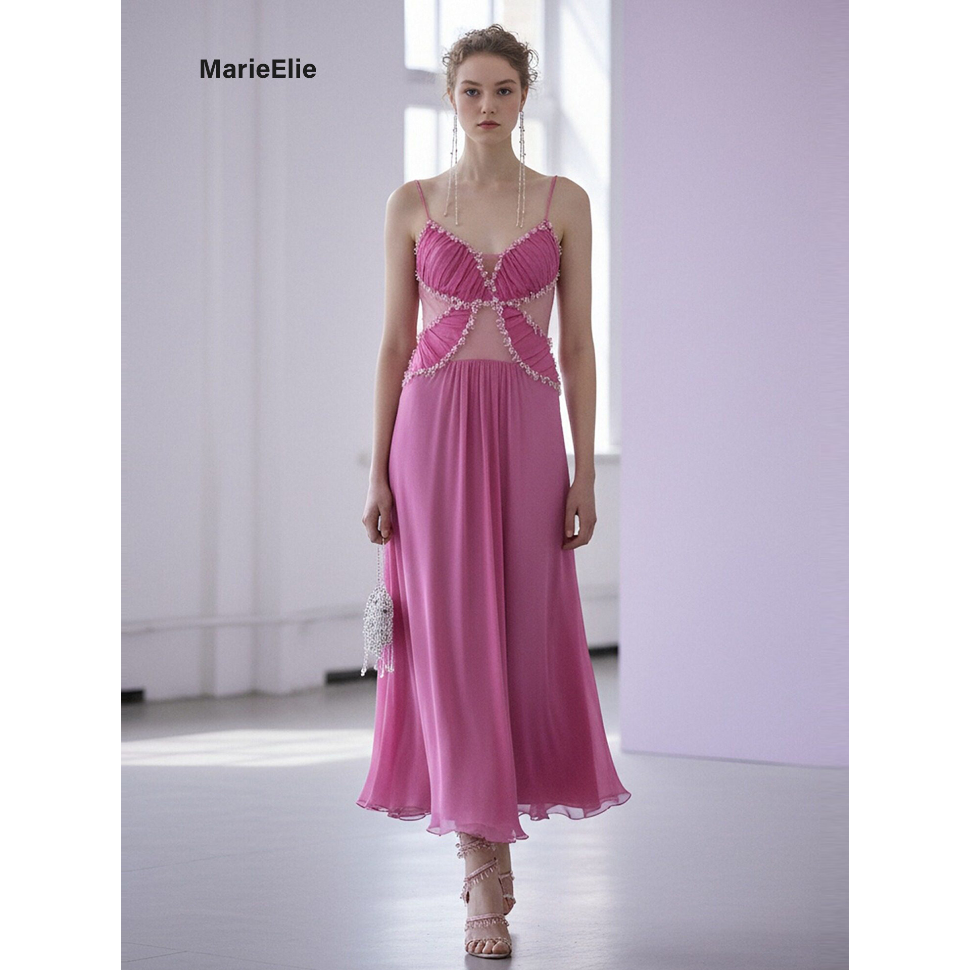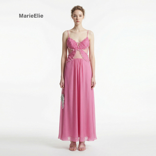 Marie Elie梦幻风玫红色吊带连衣裙女露背长裙雪纺宴会礼服