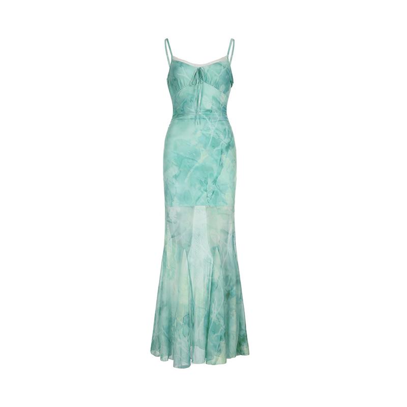 ROCKMORE 清新绿色系网纱印花吊带鱼尾长裙纯欲连衣裙 薄荷曼波