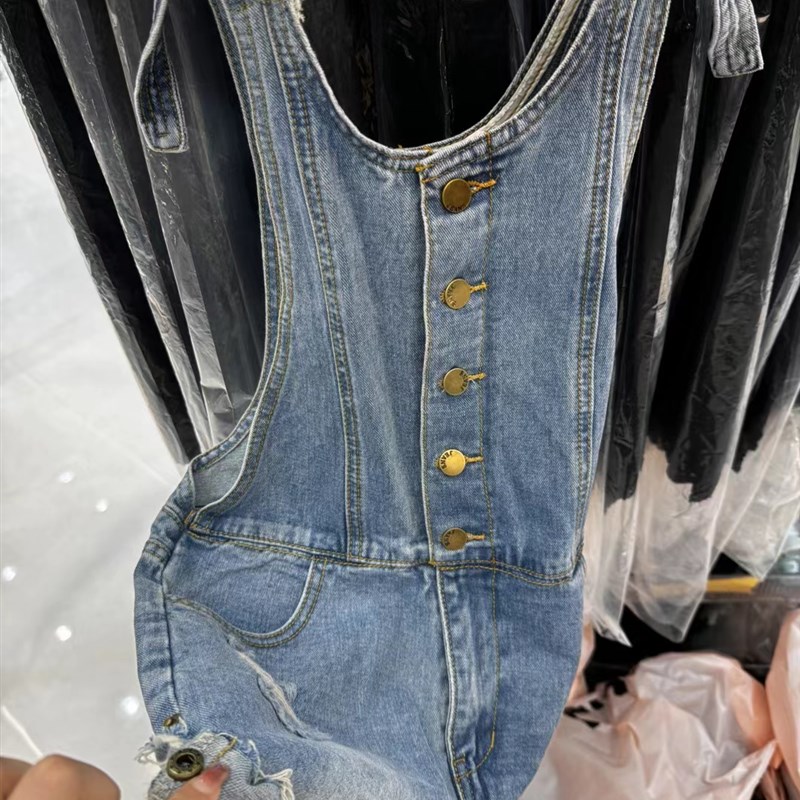 2024新款 女夏季 宽松显N瘦无袖 连体阔腿裤 破洞牛仔背带裤 热裤 短裤