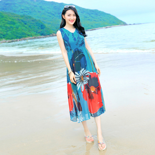 中长款 海滩裙沙滩裙夏装 雪纺连衣裙海边度假大码 波西米亚收腰无袖