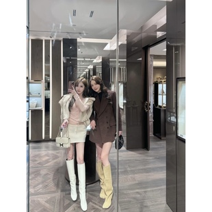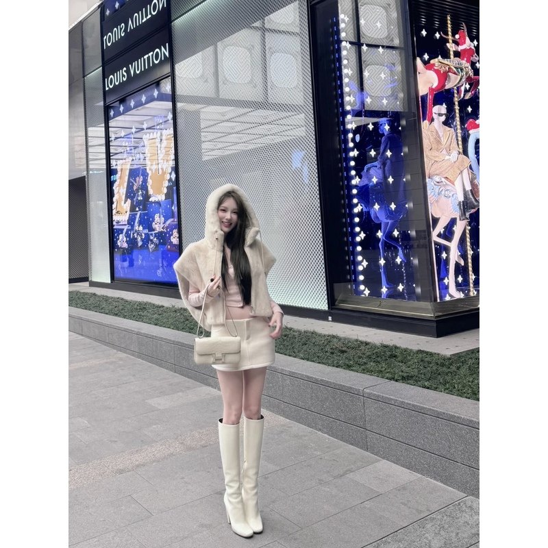 白色毛呢半裙裙子 粉嫩露肩T恤 花三三同款 小黑屋VIC
