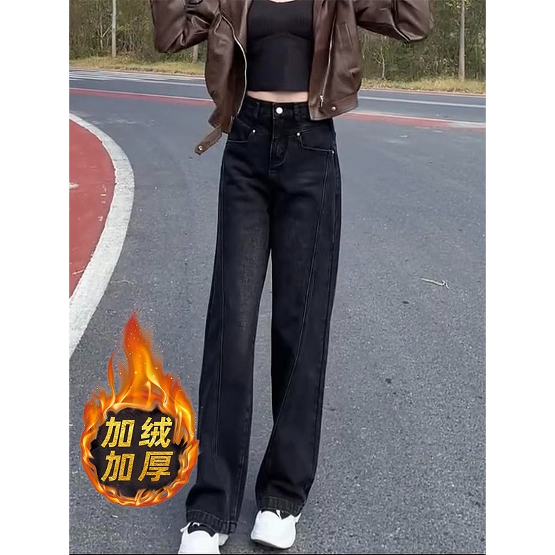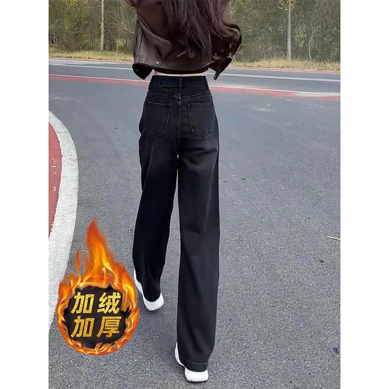 百搭显瘦宽松阔腿拖地裤 加绒加厚直筒牛仔裤 大码 新款 女2024秋冬季