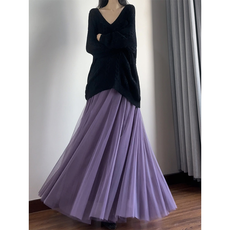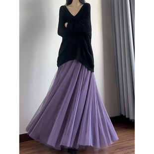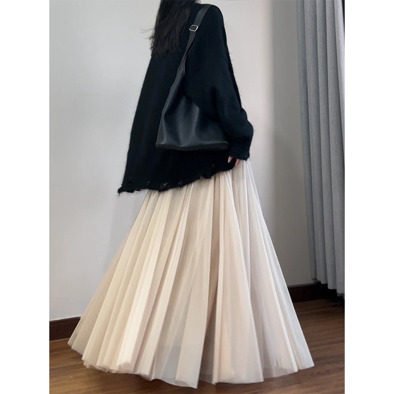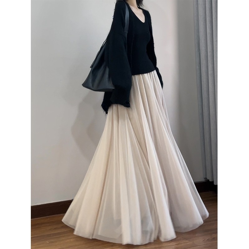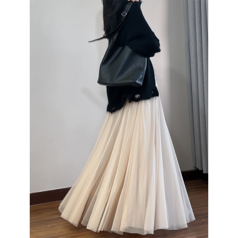 读衣术A字垂感网纱半身裙 遮跨大摆百褶长裙杏色高腰显瘦超仙纱裙