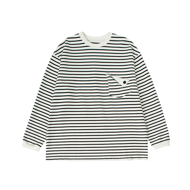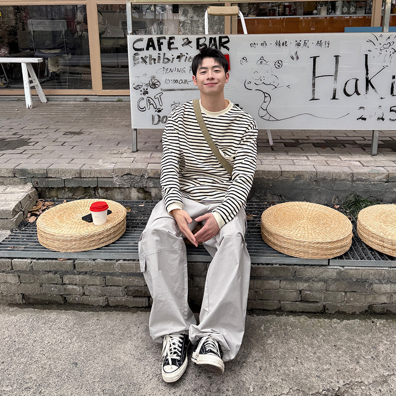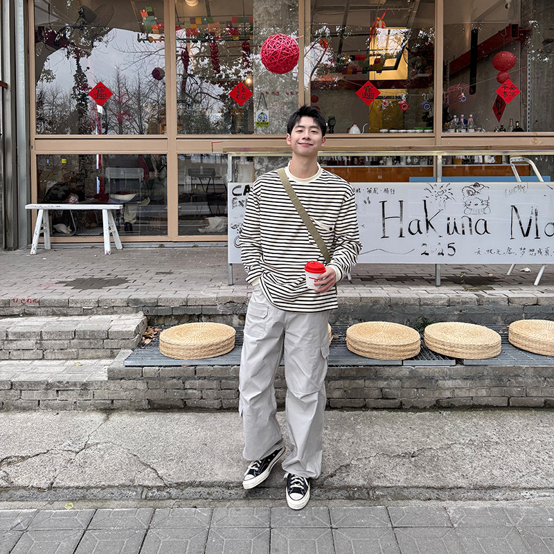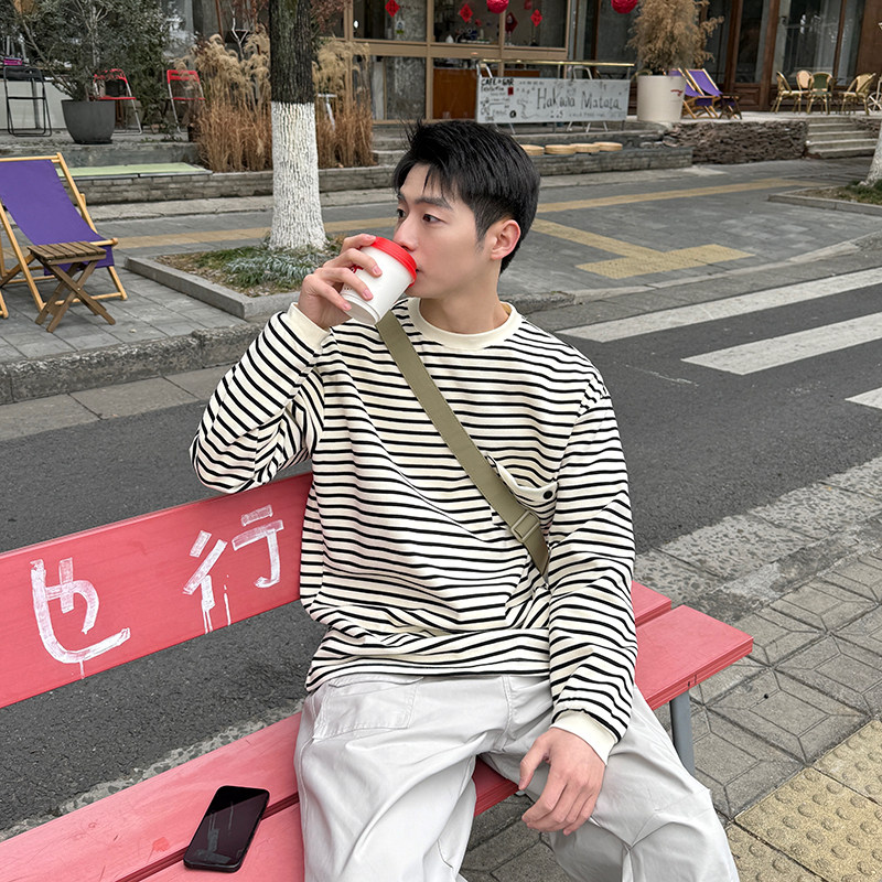 简约基础打底衫 春秋季 T恤男生2025新款 280g条纹口袋圆领套头长袖