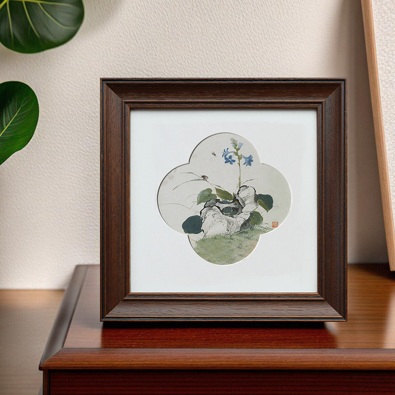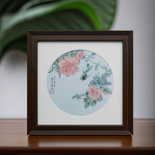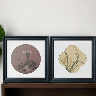 复古黑色中国风画框字画水彩国画胡桃木色圆形海棠花型相框带卡纸