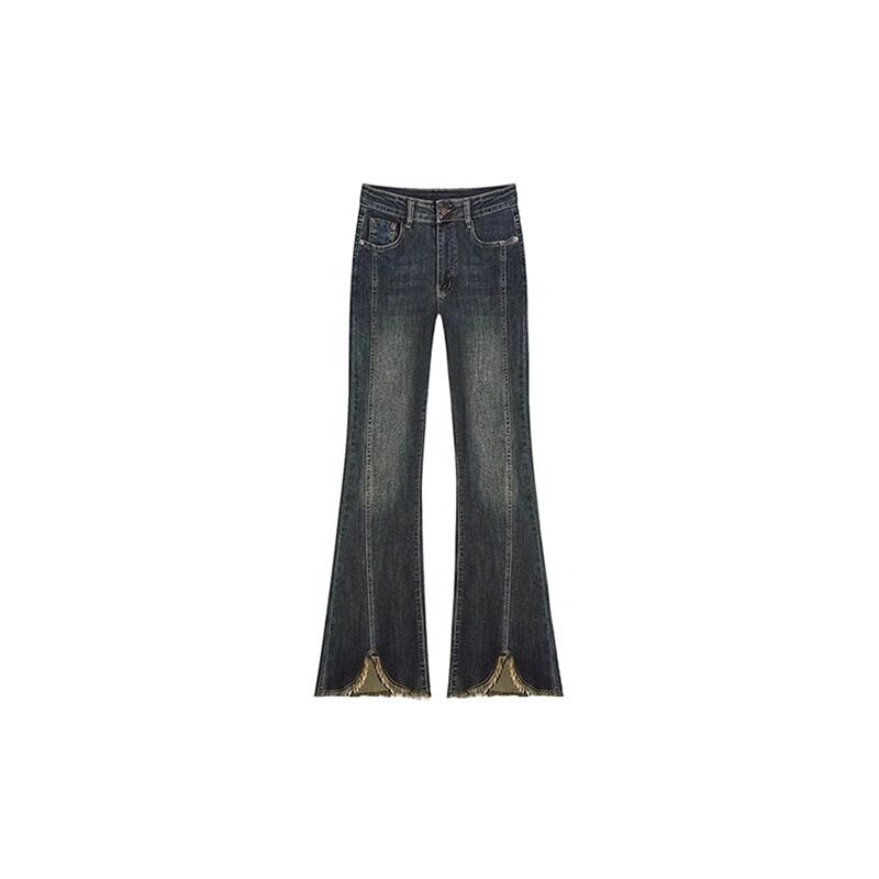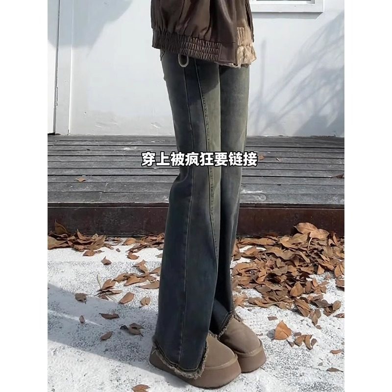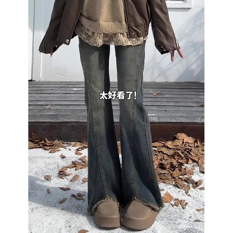 胖mm高腰显瘦遮胯弹力喇叭裤 大码 女春秋新款 复古蓝毛边微喇牛仔裤