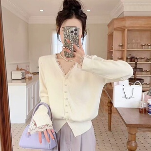 上衣 百搭淑女打底毛衣气质显瘦长袖 蕾丝边V领针织开衫 女春秋新款