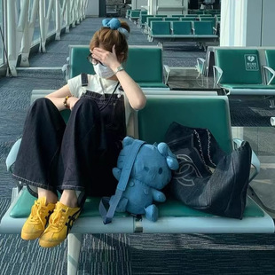 潮 宽松复古减龄显瘦直筒阔腿裤 奶fufu牛仔背带裤 女秋冬小个子韩版