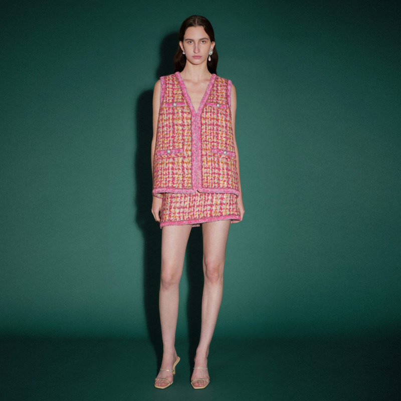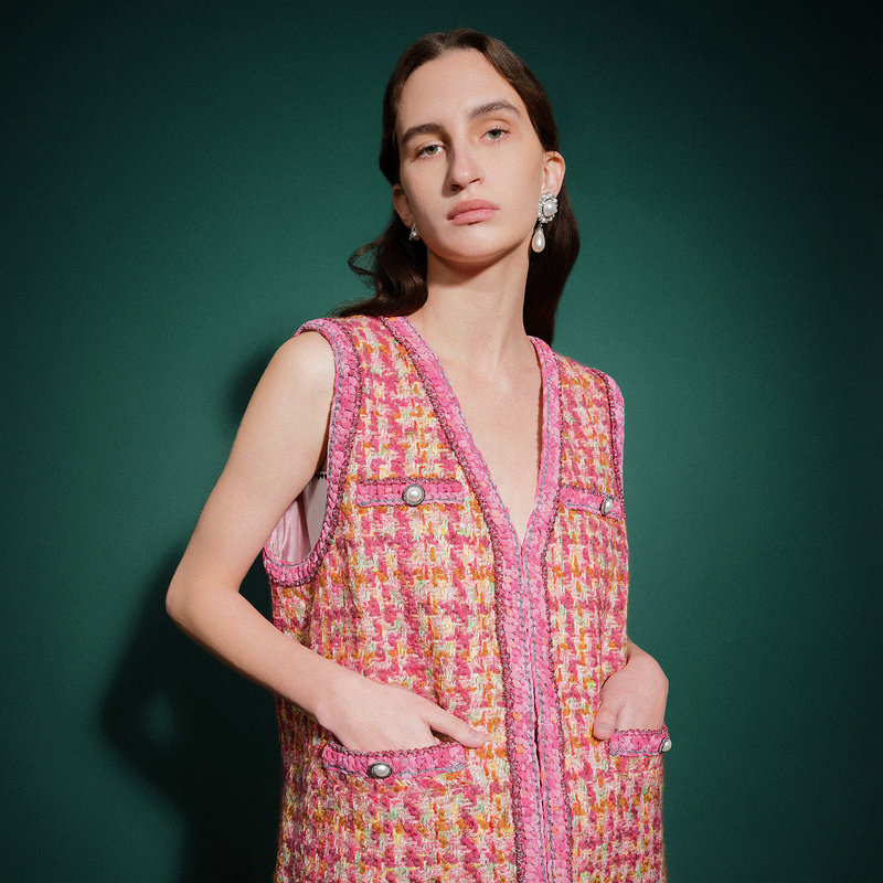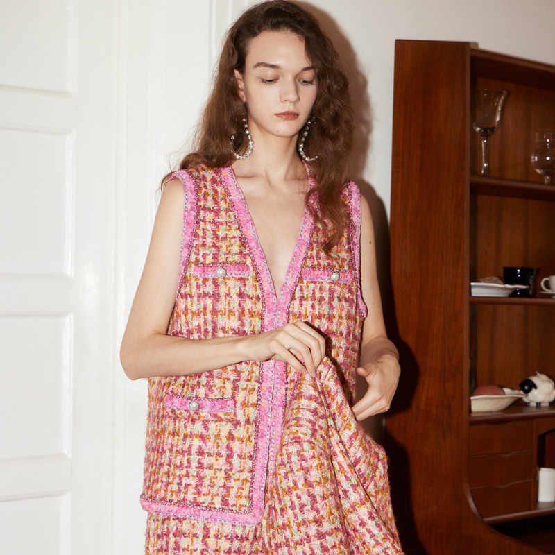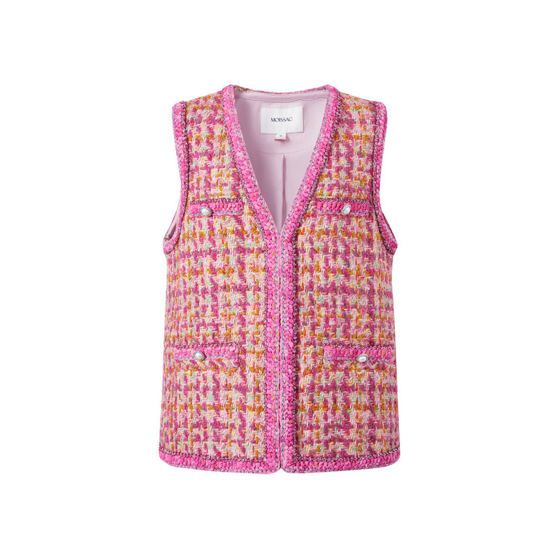 商场同款 重工编织单排扣小香风粗花呢编织马甲女 摩萨克春装