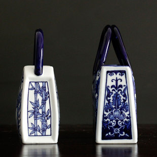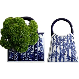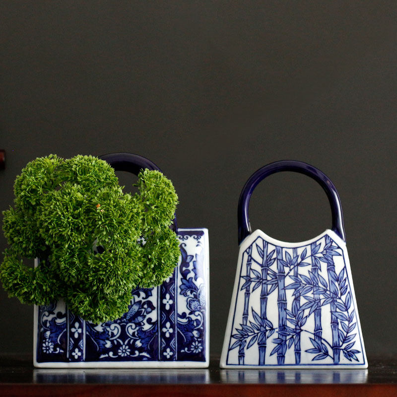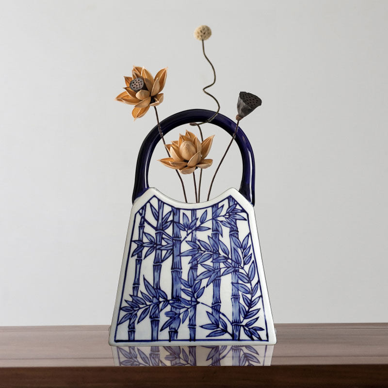 饰插花器花器餐桌摆件 青花瓷客厅装 新中式 陶瓷花瓶手提包布袋中式