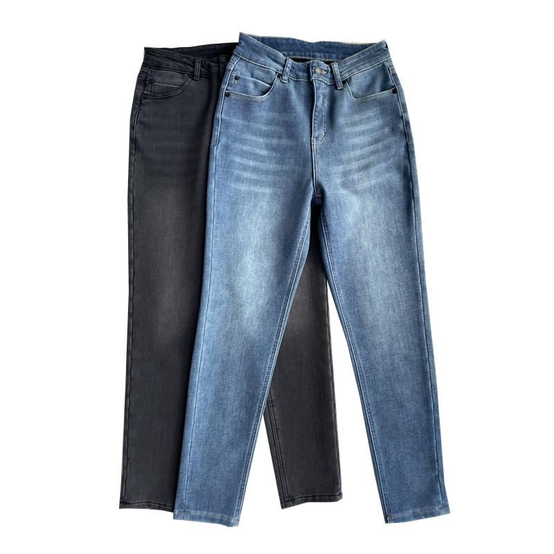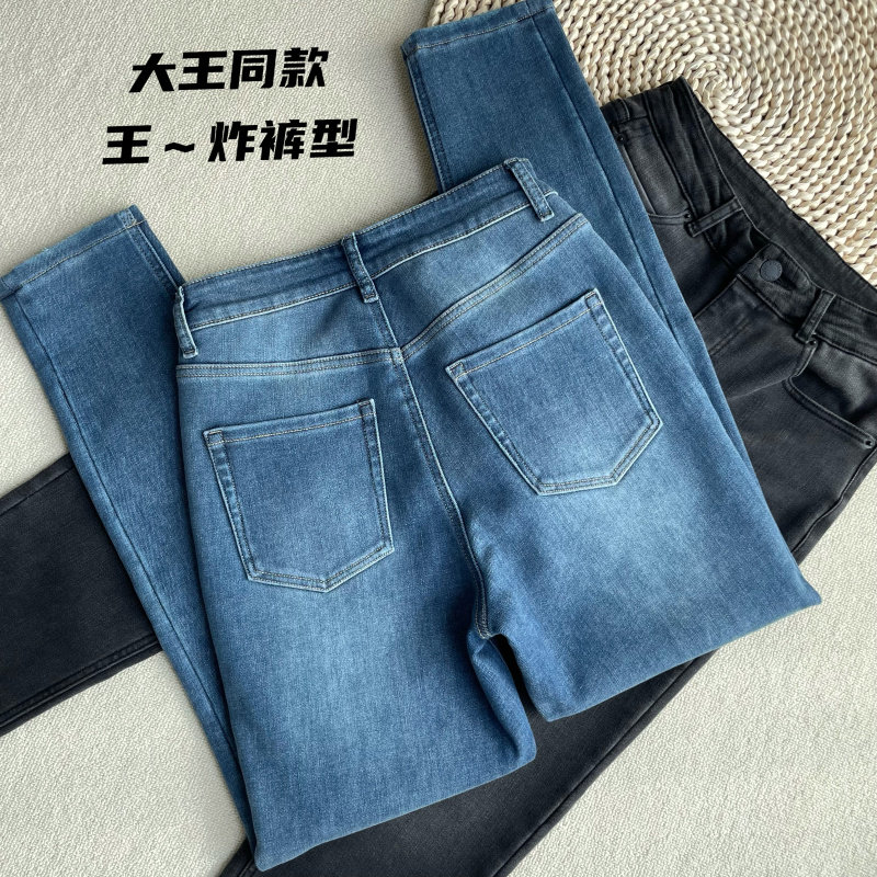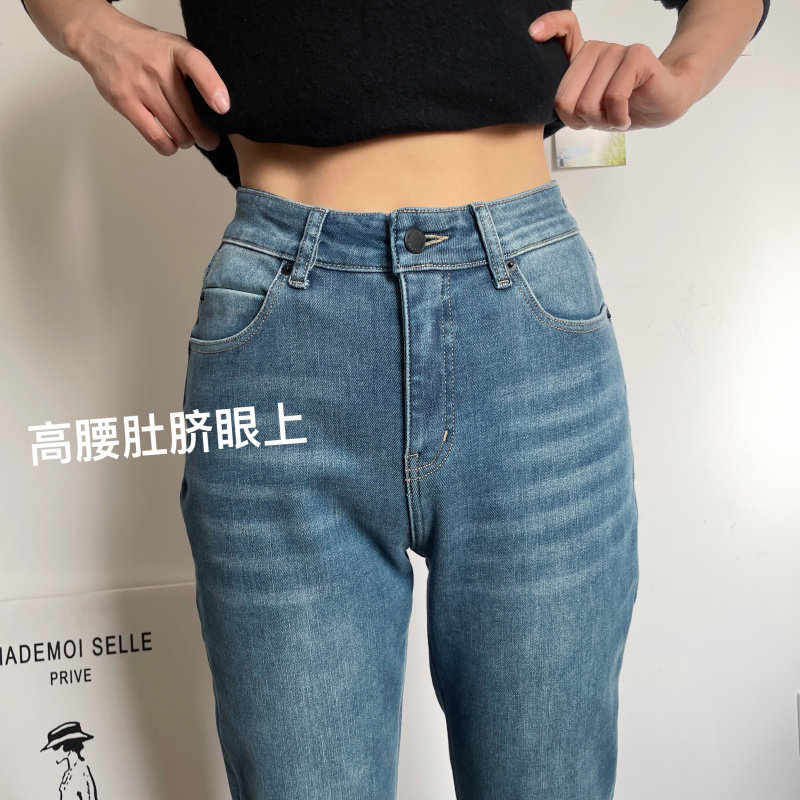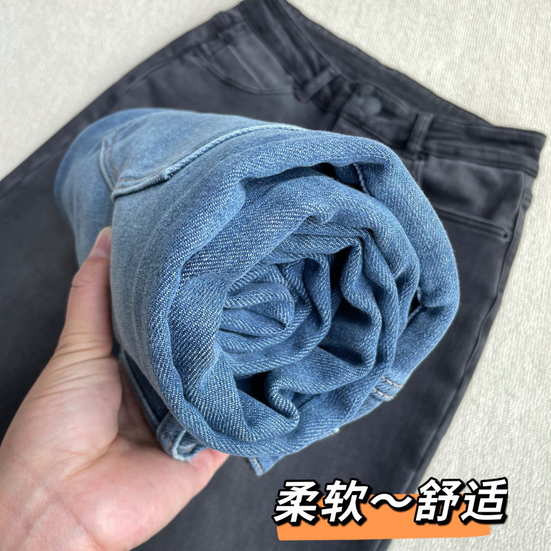 秋冬高腰加绒保暖显瘦烟灰色直筒锥形小脚口弹力牛仔长裤 女大王款