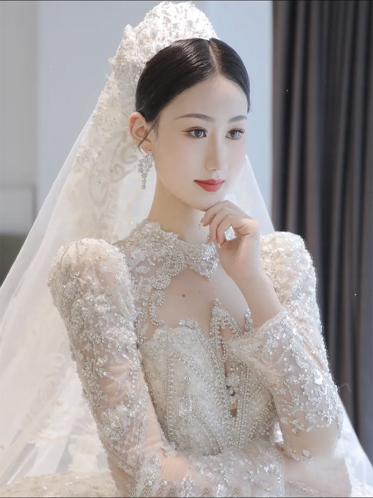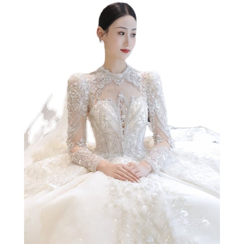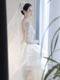 宫廷风迎宾仪式 婚纱新娘2025新款 长袖 V领重工奢华冬季 纱 主纱法式