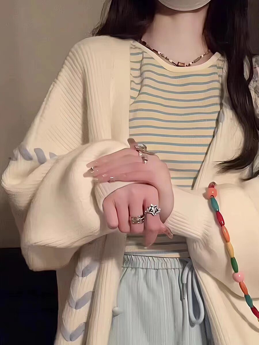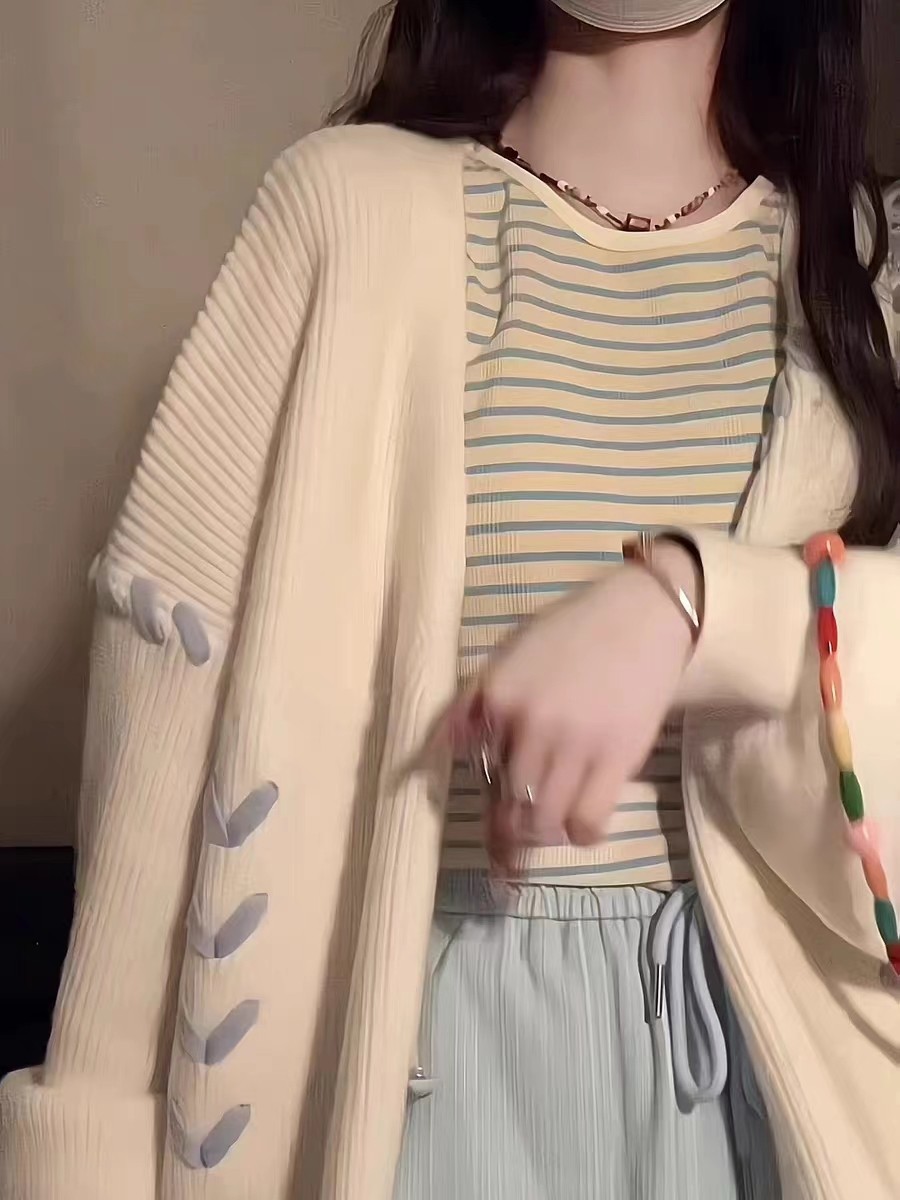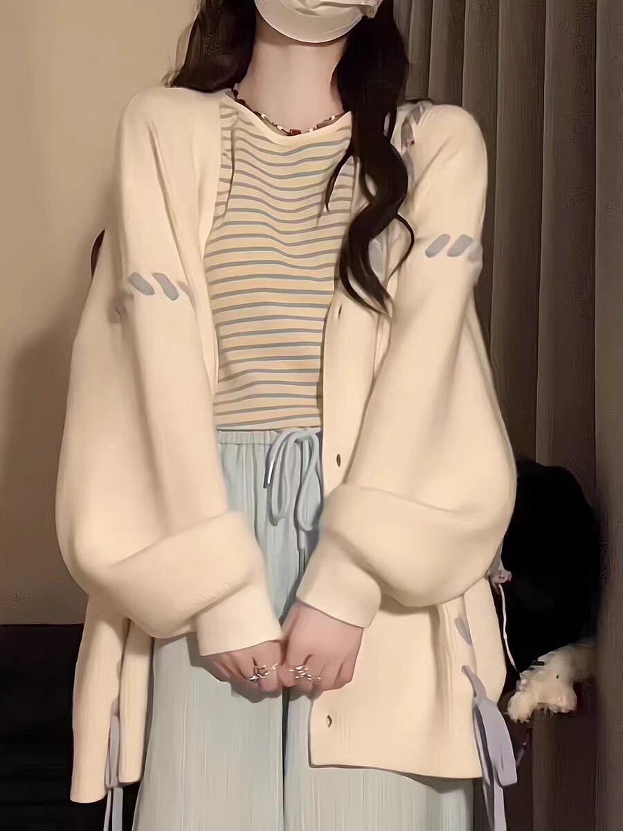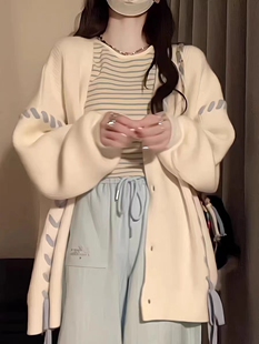 外套 复古软糯毛衣女春秋冬宽松慵懒风爱心绑带设计感开衫 大码 美式