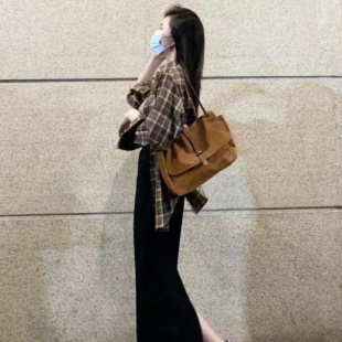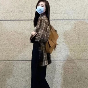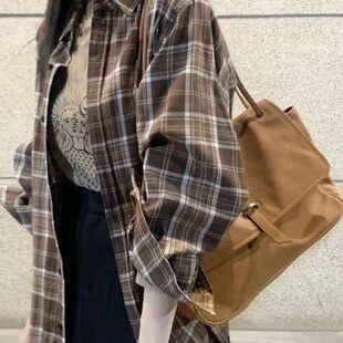 气质简约百搭格纹衬衫 磨毛格子休闲长袖 新款 2023年春季 衬衣中长款
