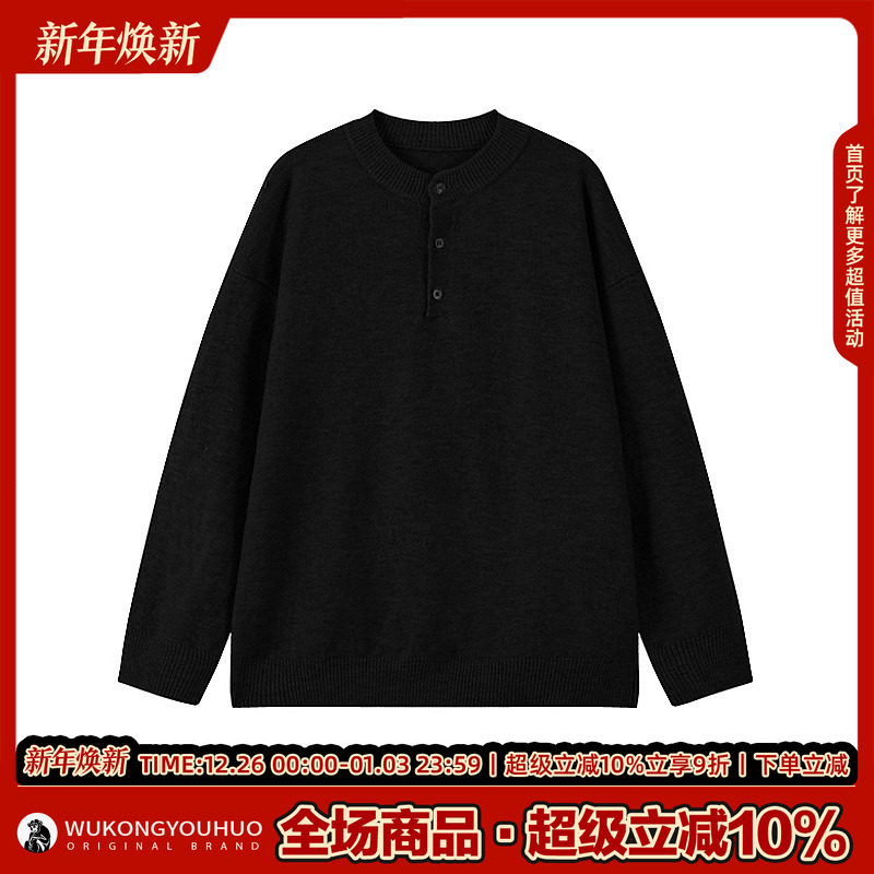 悟空有货复古纯色亨利领毛衣秋季 潮牌高级感休闲百搭套头针织上衣
