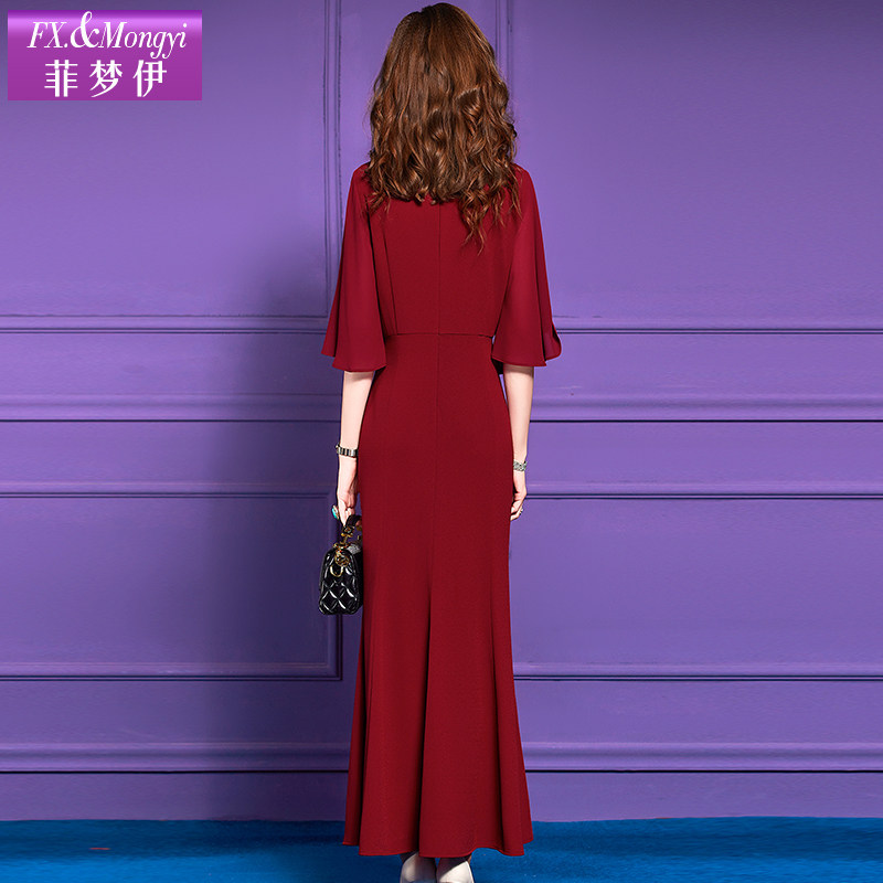 鹿与玫瑰法式 显瘦订婚礼服敬酒服 复古红色一字肩连衣裙女气质修身