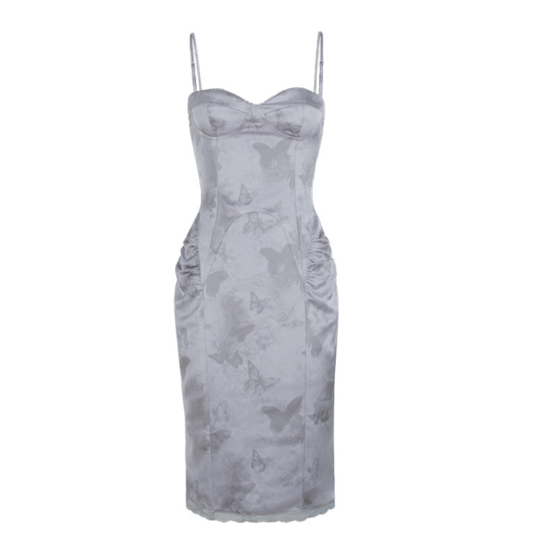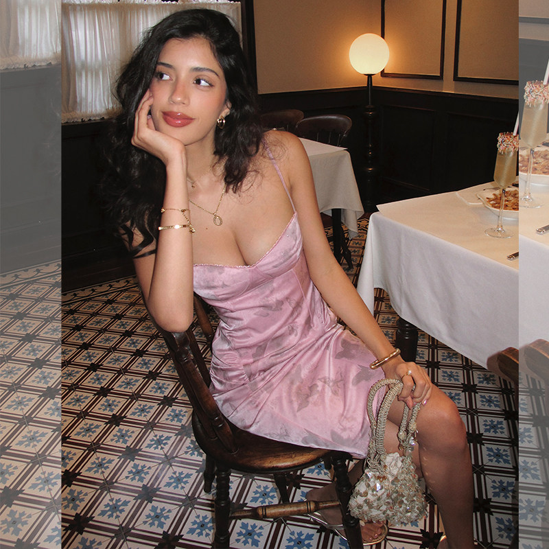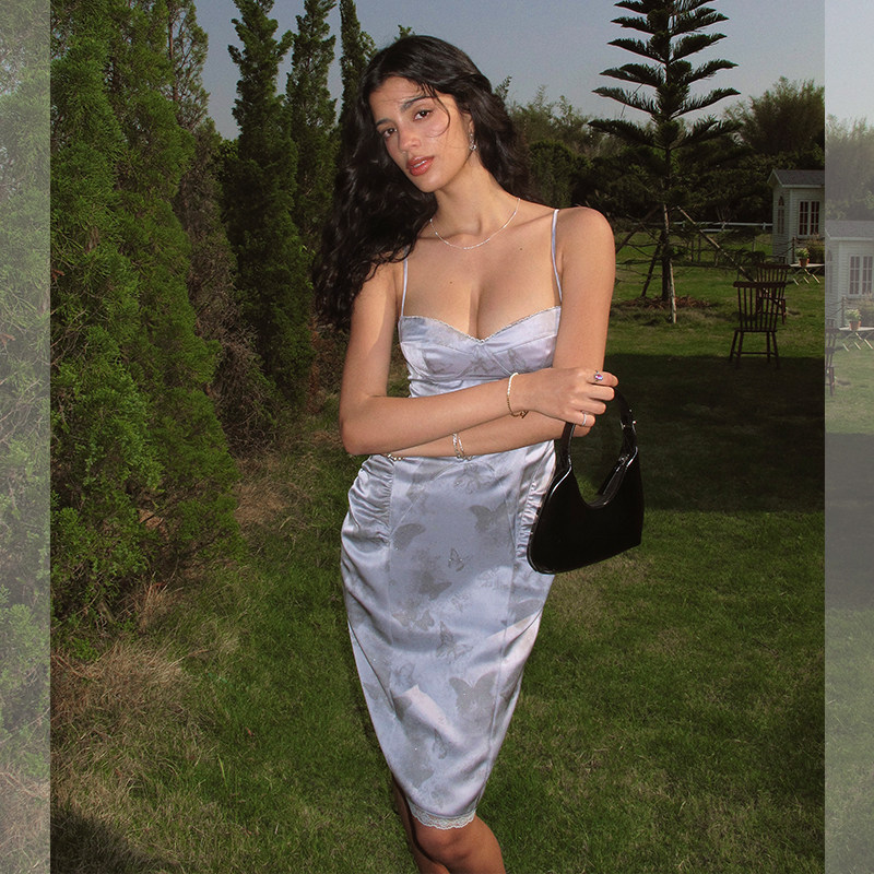 ITSNIKAR 蕾丝拼接吊带连衣裙女夏细闪蝴蝶包臀裙立体显瘦短裙子