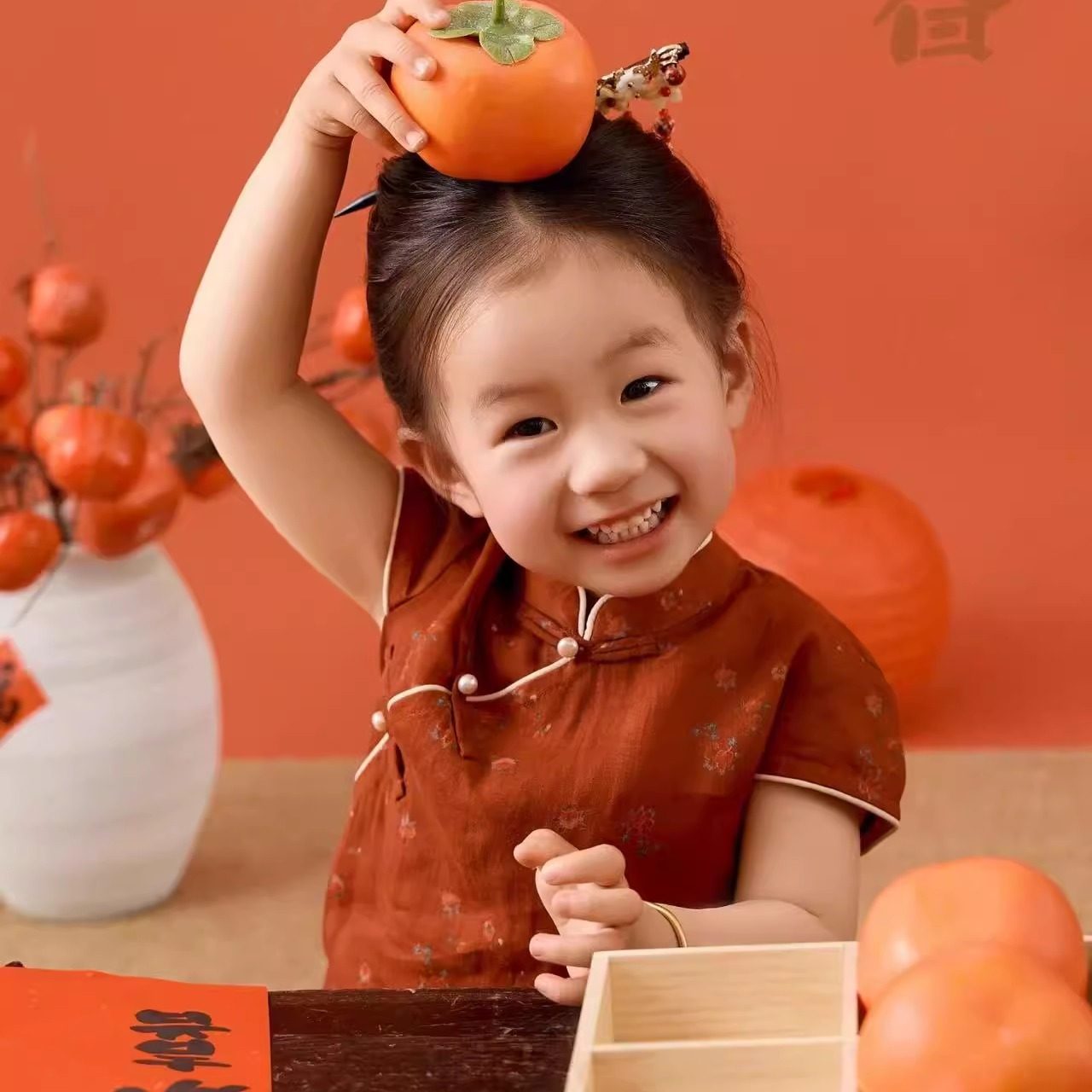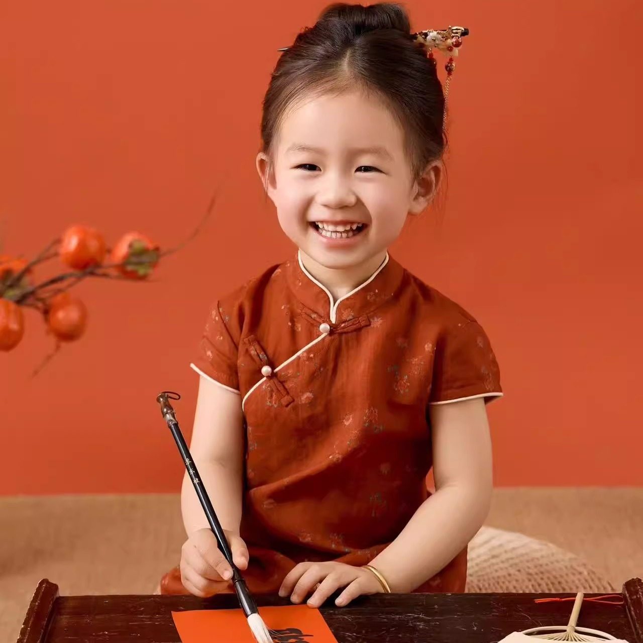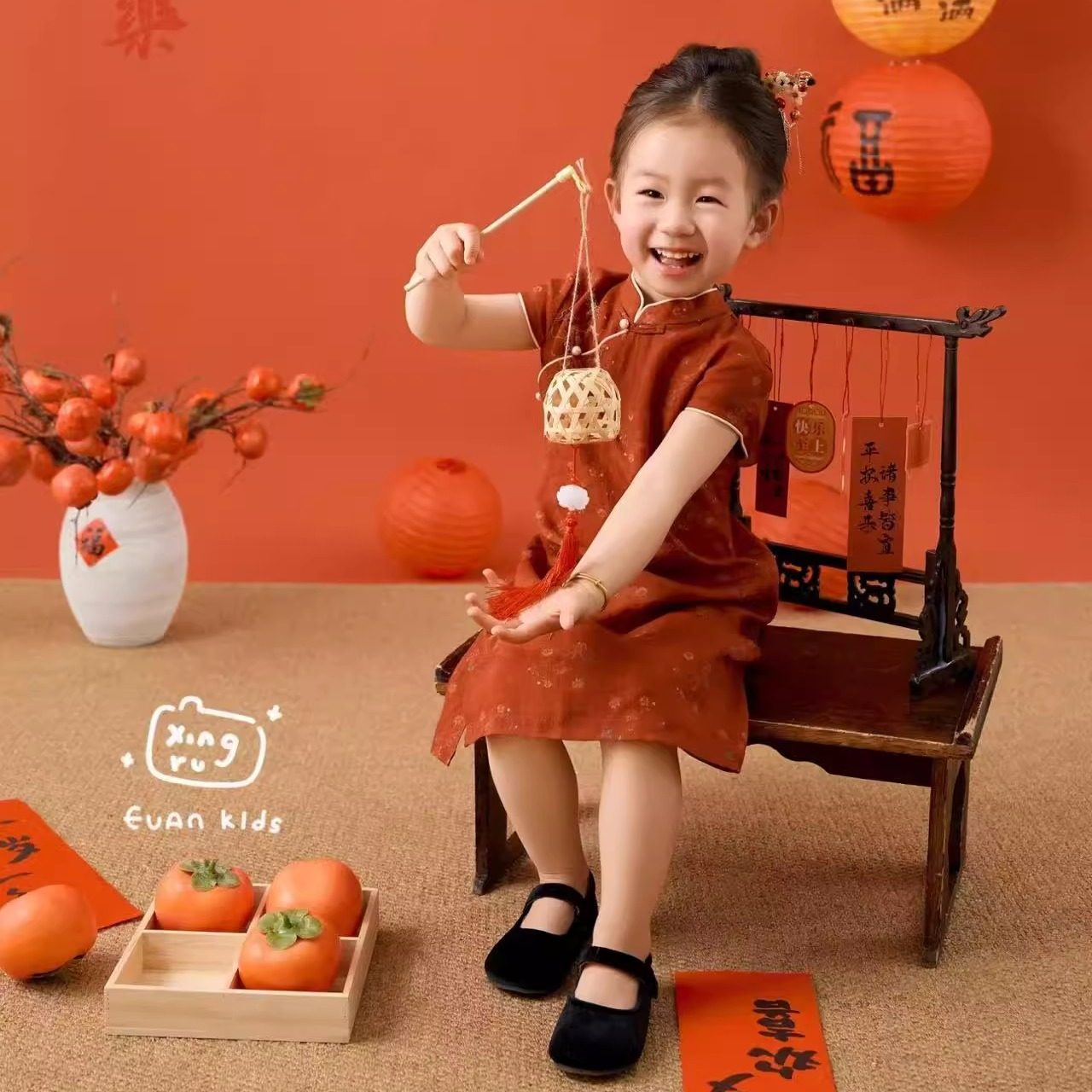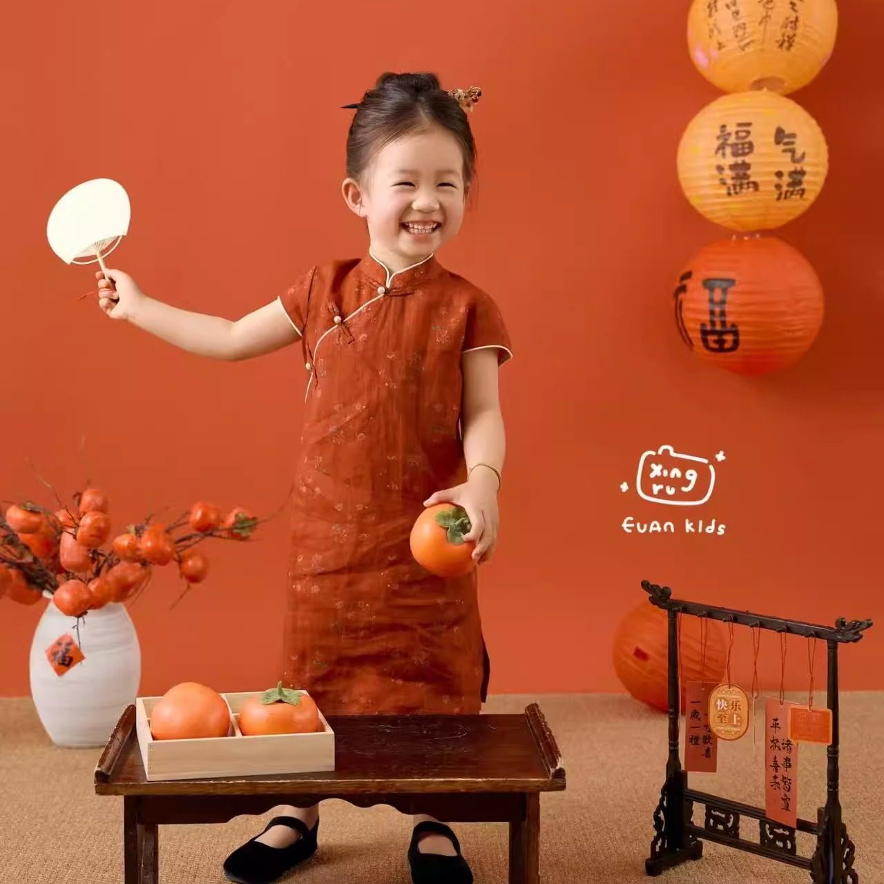 小女孩古风民国风连衣裙 艺术新中式 红色女童盘扣旗袍摄影服装 薄款
