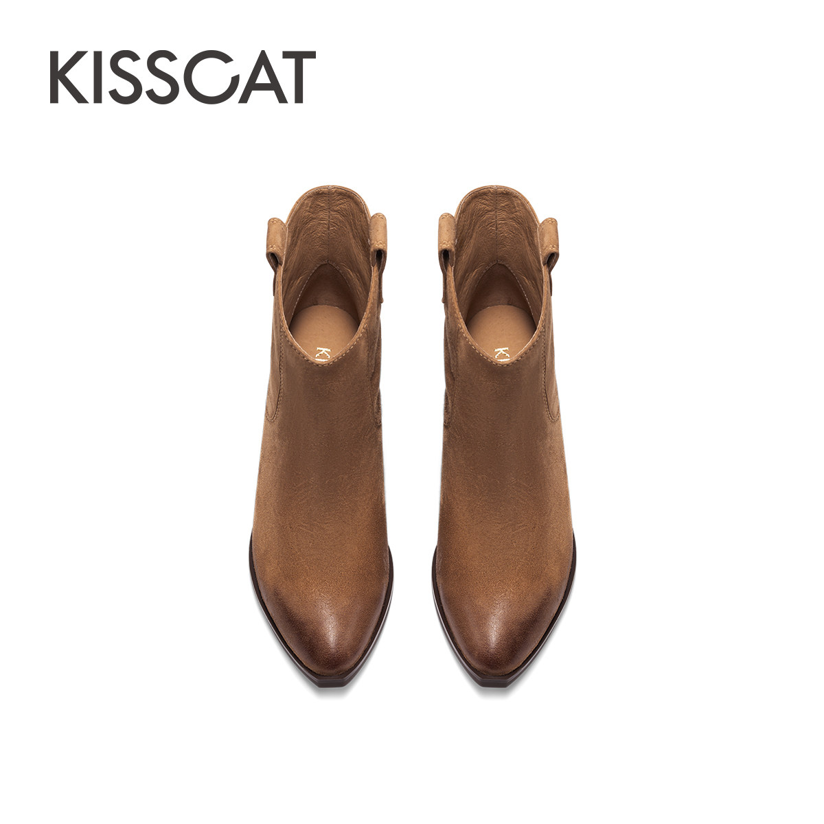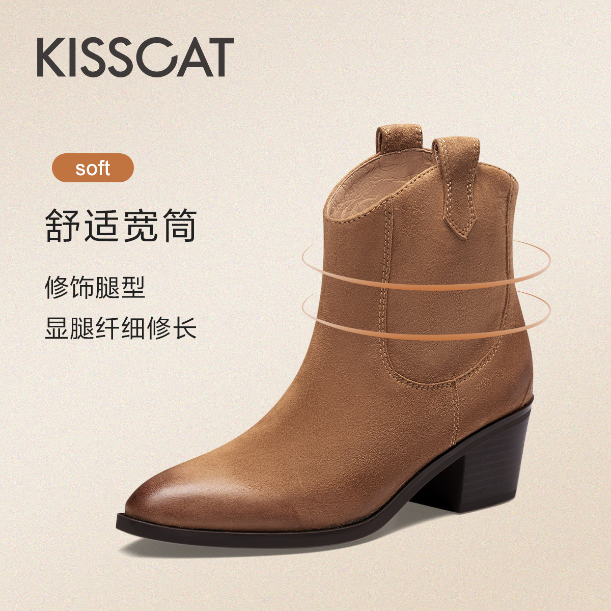 堆堆西部牛仔尖头骑士靴子加绒皮鞋 达芙妮棕色短靴女2025新款 冬季