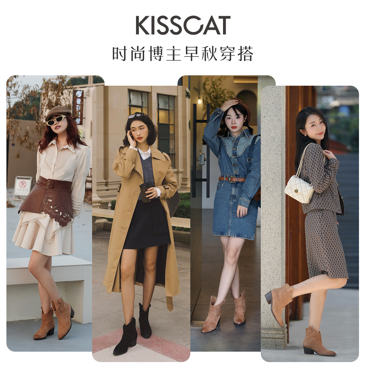 周雨彤同款 百丽女靴周游世界复古美拉德西部靴加绒雪地靴短筒靴