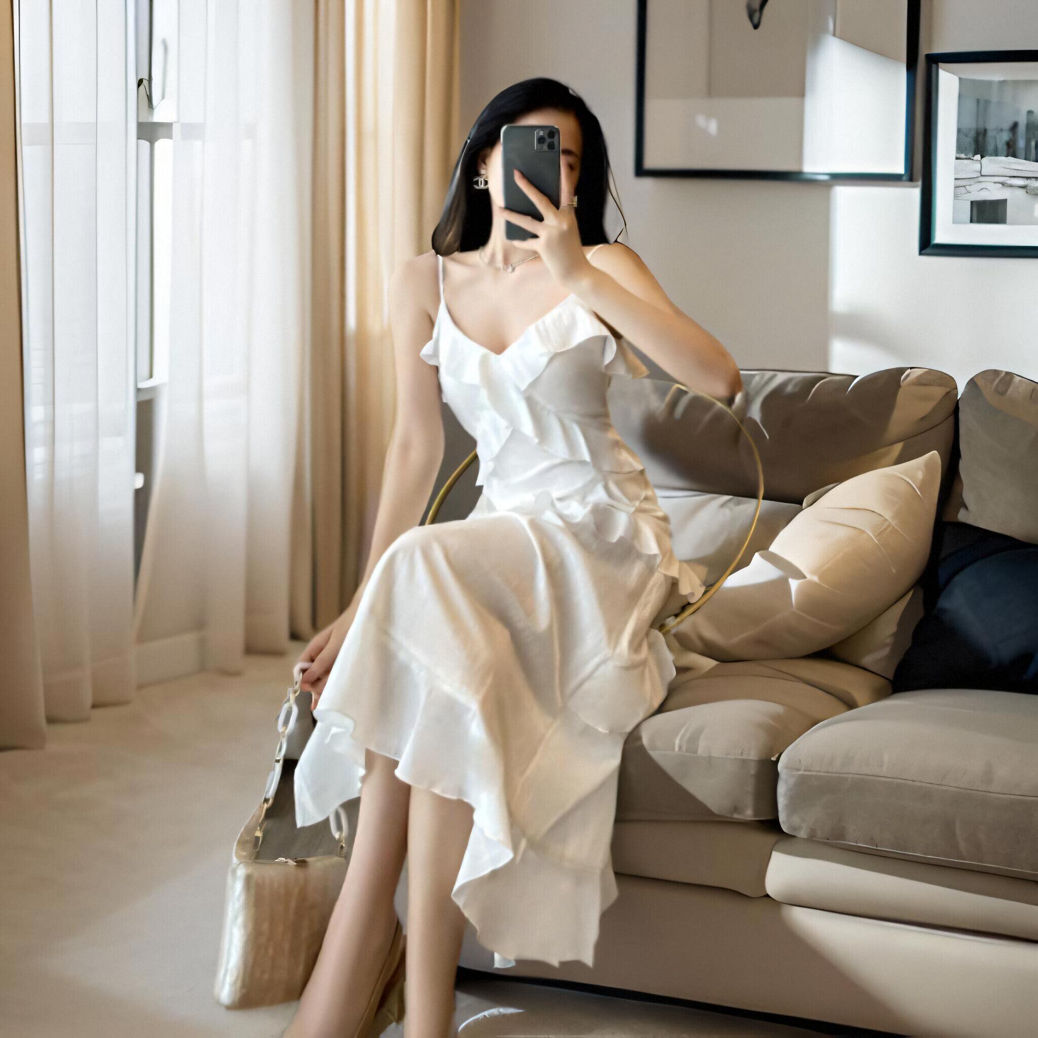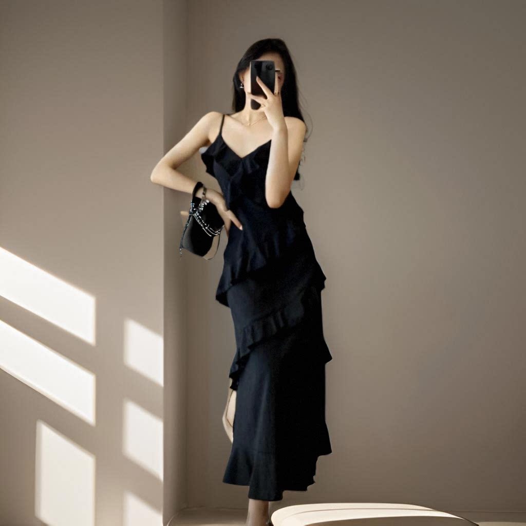休闲连衣裙女无袖 法式 小个子挂脖连衣裙高腰黑色背带裙名媛修身