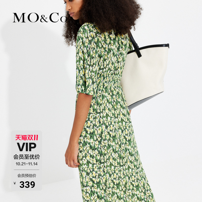 摩安珂 春夏薄荷曼波印花V领打揽高腰木耳边连衣裙 MOCO奥莱