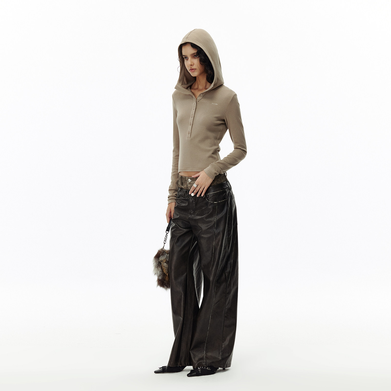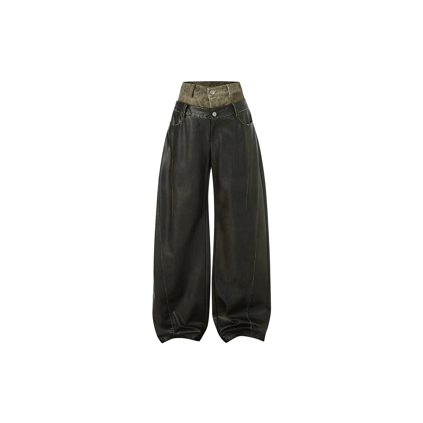 复古显瘦阔腿黑色裤 女秋冬美式 子 直筒pu裤 IMXS豹纹腰头擦色长裤