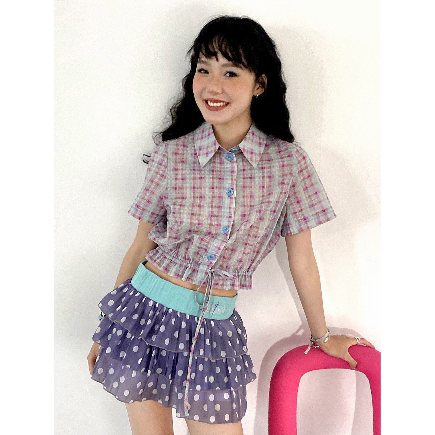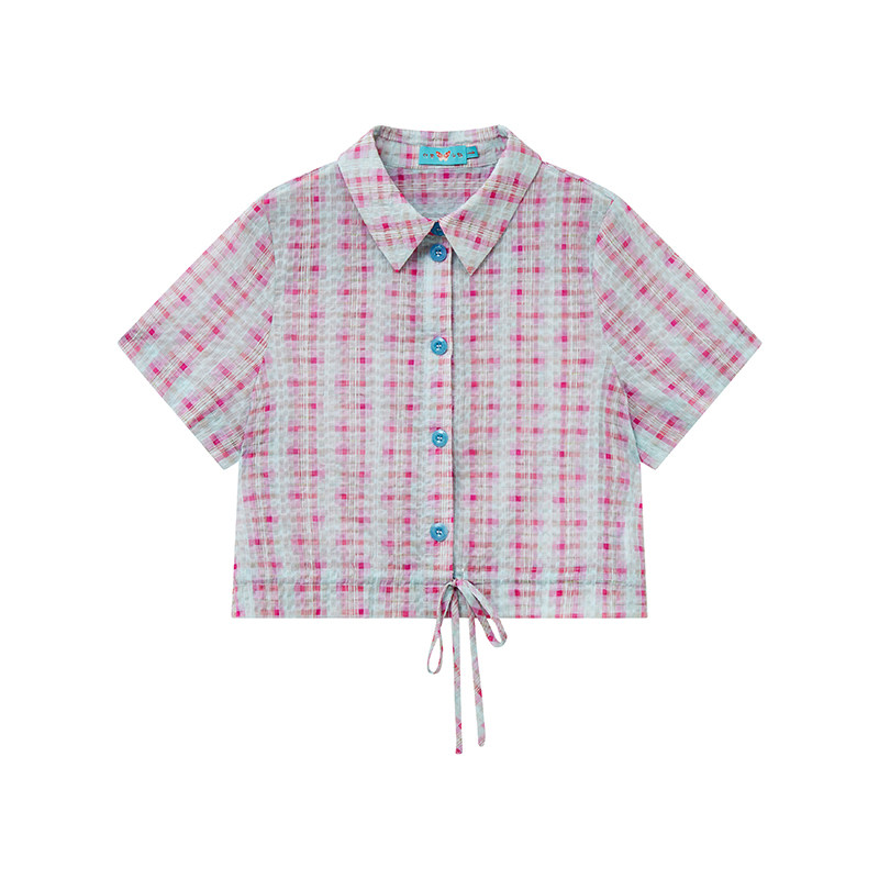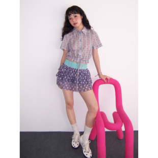上衣纯棉女夏新品 衬衫 「泡沫密语」粉蓝格抽褶短袖 化学少女