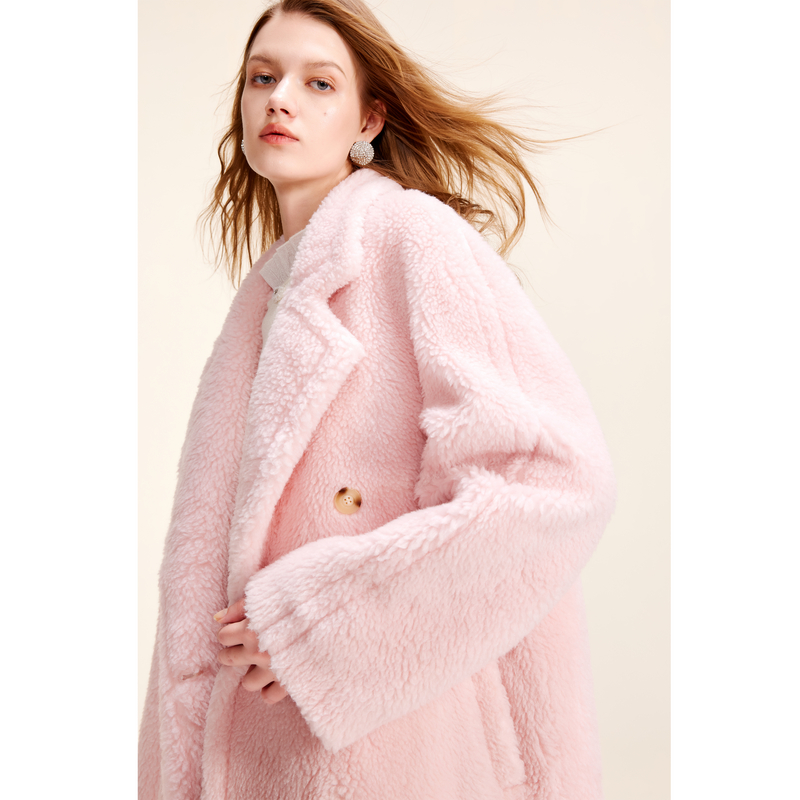 可可尼COCOON2025冬季 通勤翻领高知休闲绵羊毛粉色皮草外套女 新款