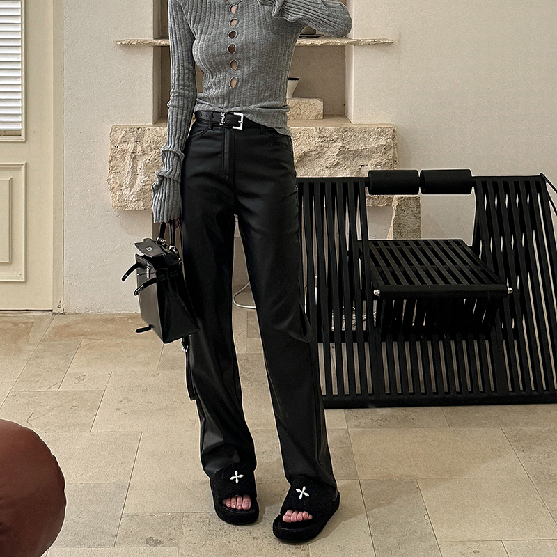 高腰宽松显瘦直筒裤 浅布调高个子加长裤 阔腿裤 拖地窄版 黑色PU皮裤