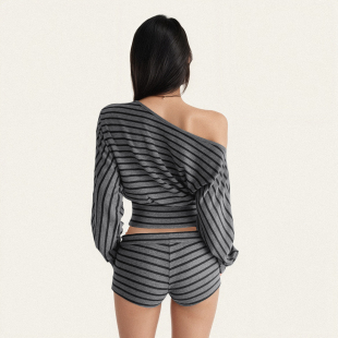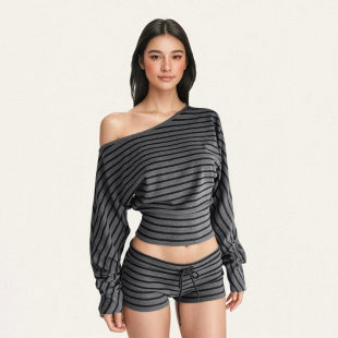 两件套装 FUNOFF T恤上衣低腰绑带超短裤 复古条纹斜肩露脐长袖 美式