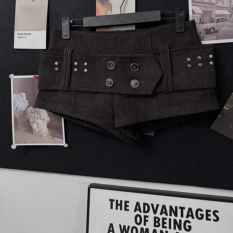 女酷辣风设计感辣妹裤 BIG BIU宽腰带钉扣低腰无弹包臀灯芯绒短裤