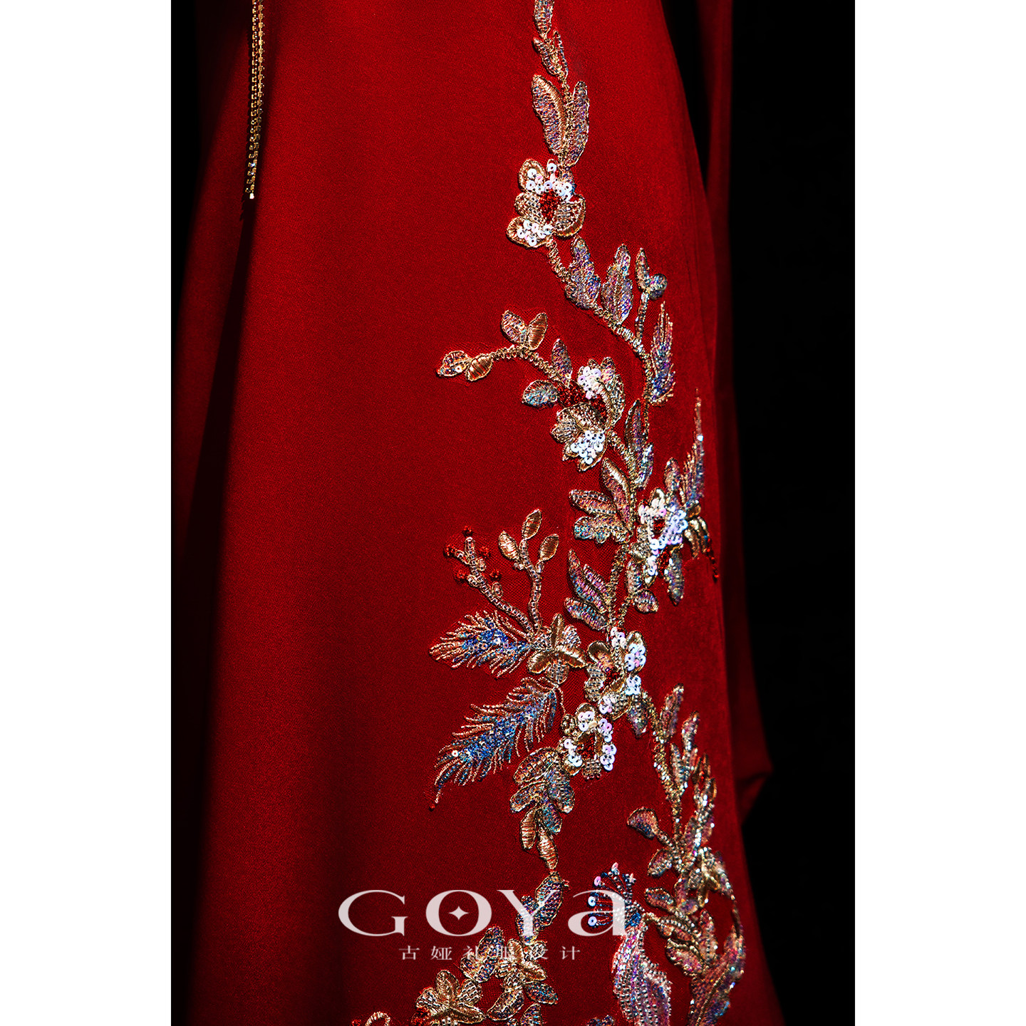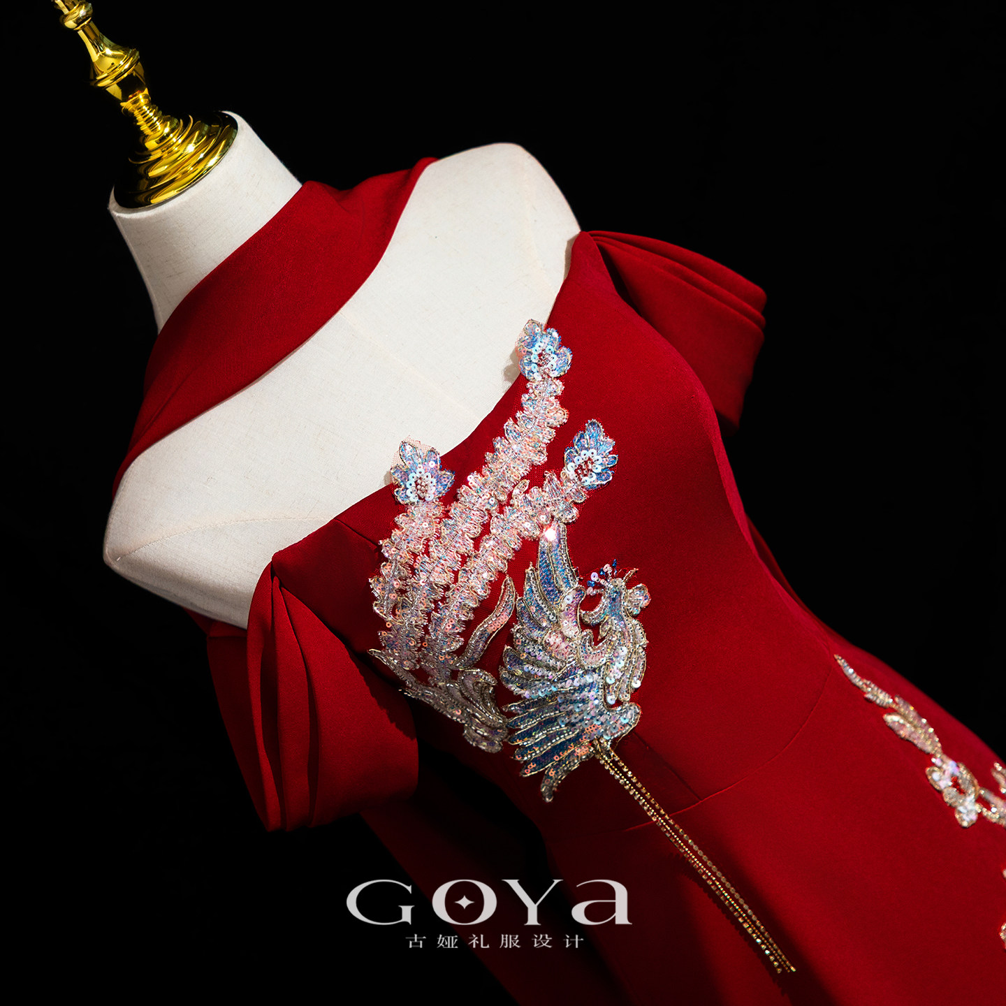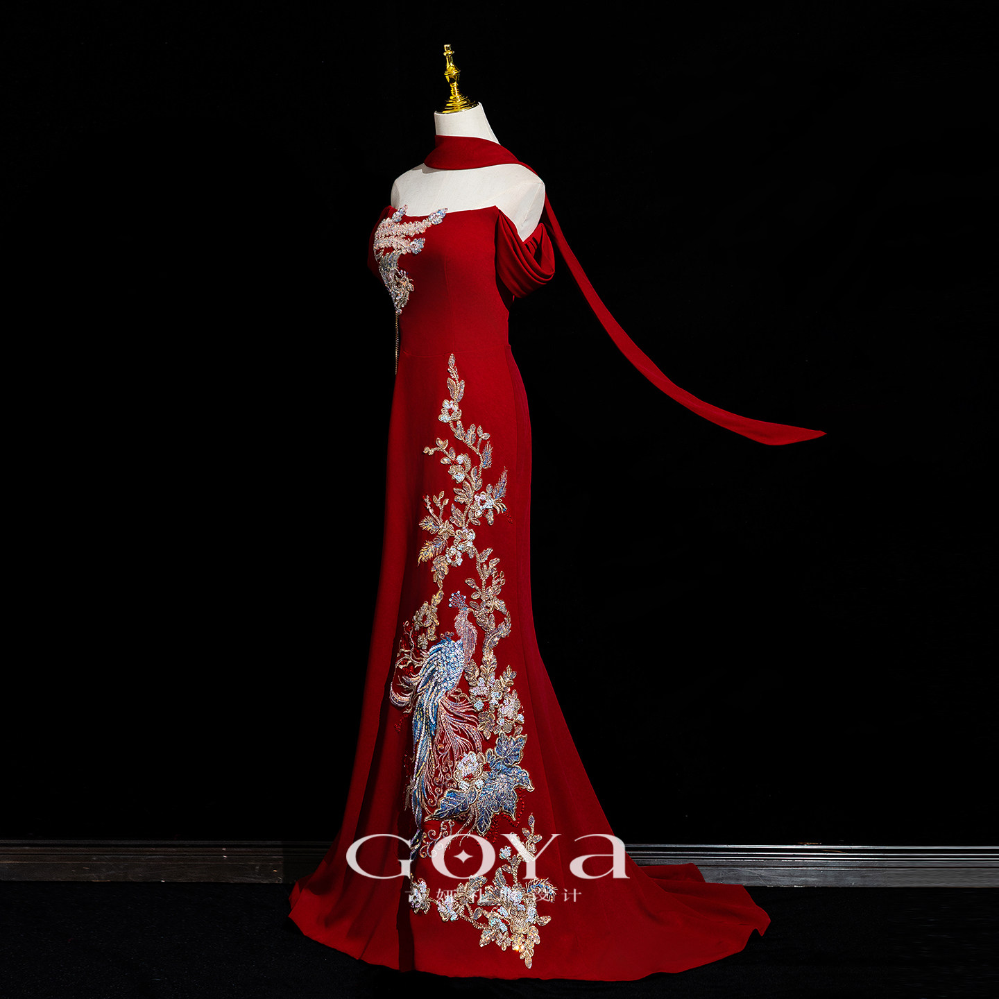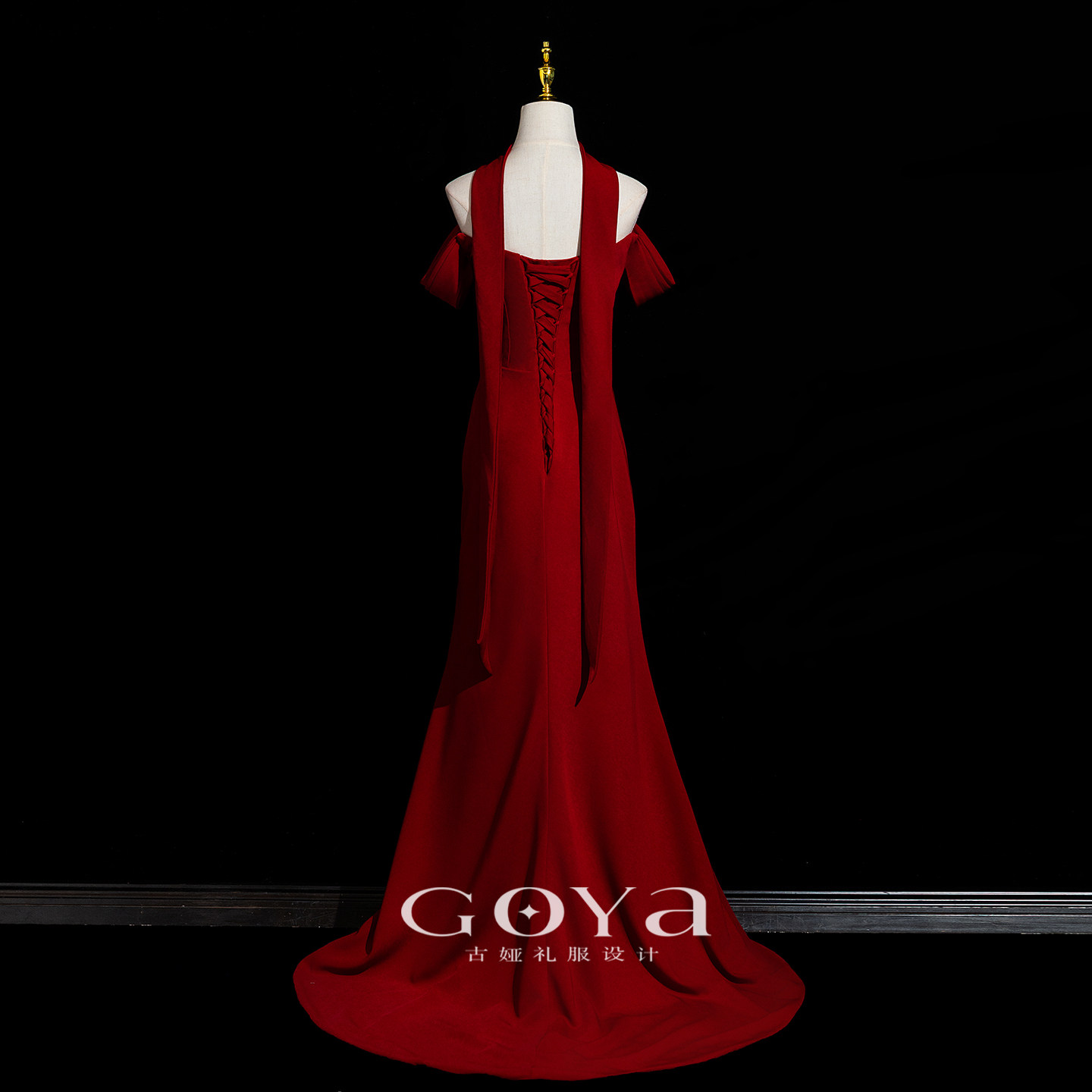 一字肩鱼尾敬酒服新娘结婚出阁宴回门服新中式 订婚礼服红色高级感