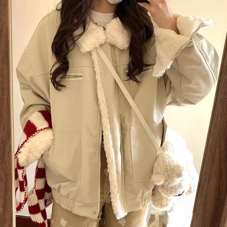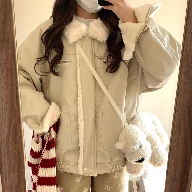复古加绒加厚保暖棉衣外套 宽松美式 翻领羊羔毛外套女冬季 2024新款