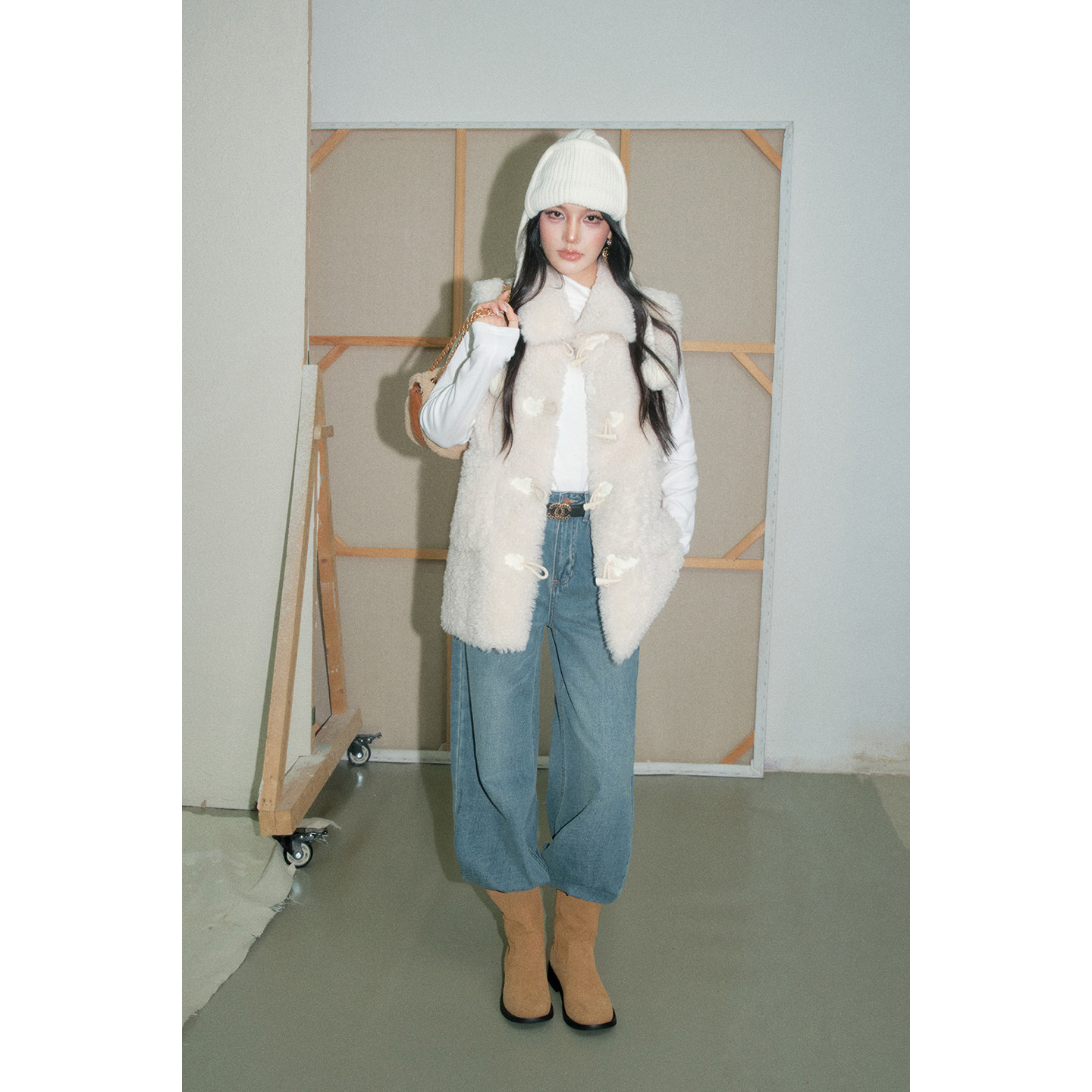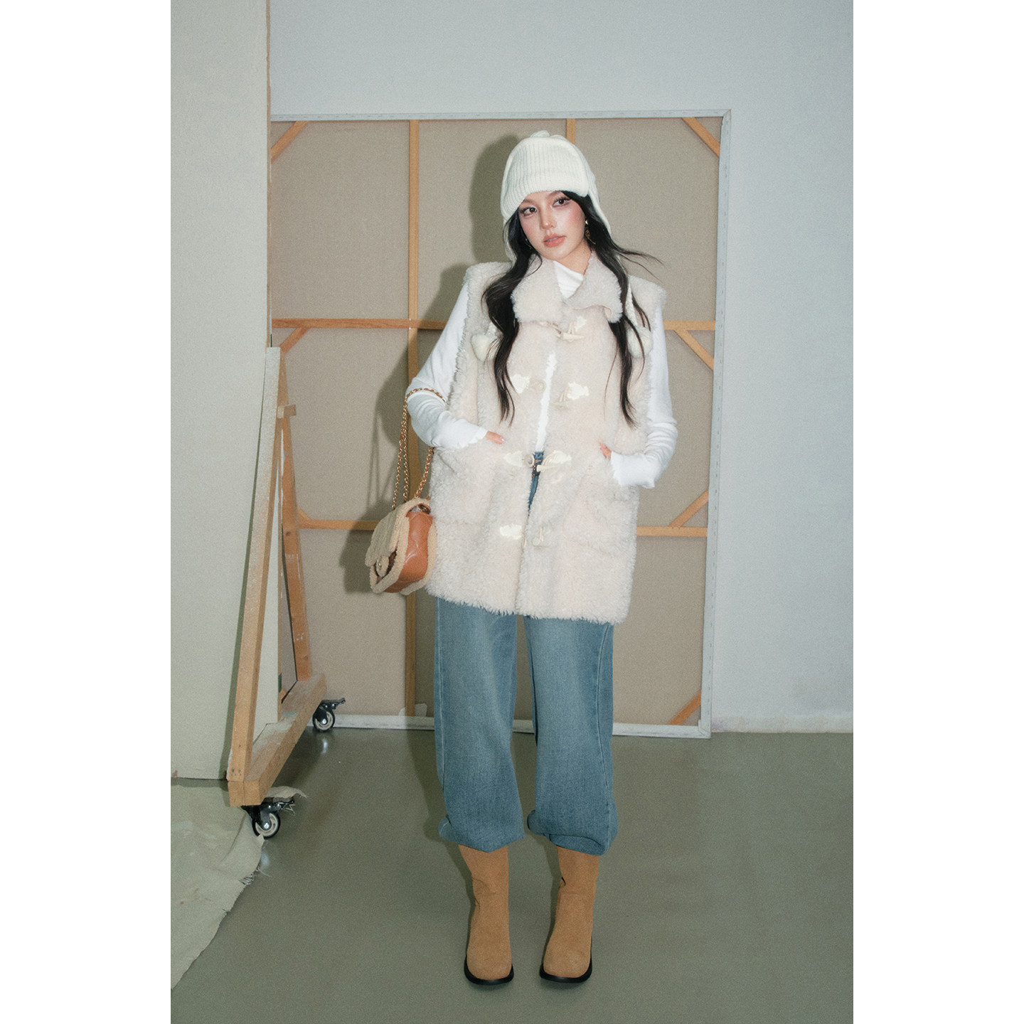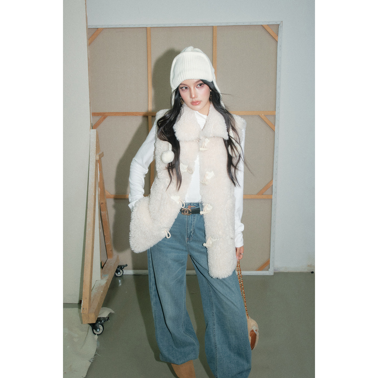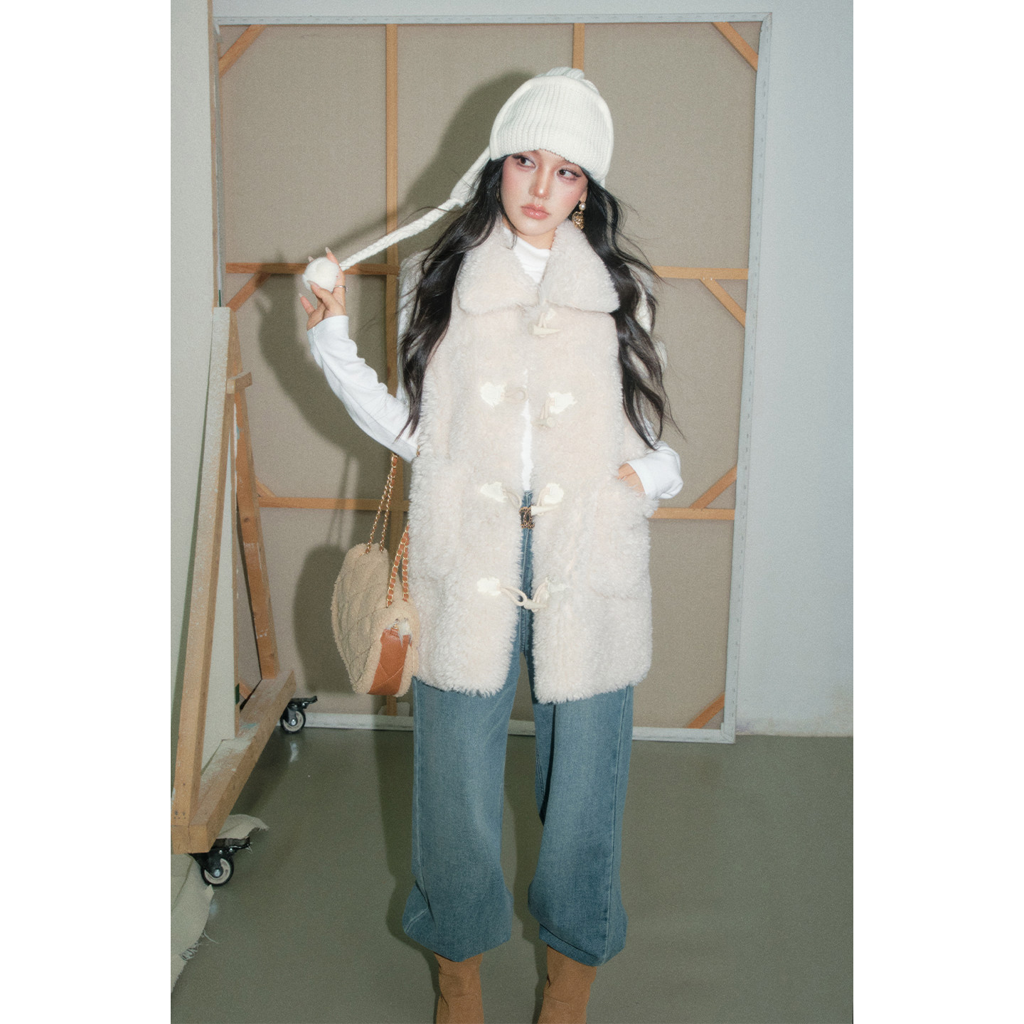 新款 DUO白色毛绒马甲2025冬季 OLIVIA 保暖牛角扣坎肩上衣 现货