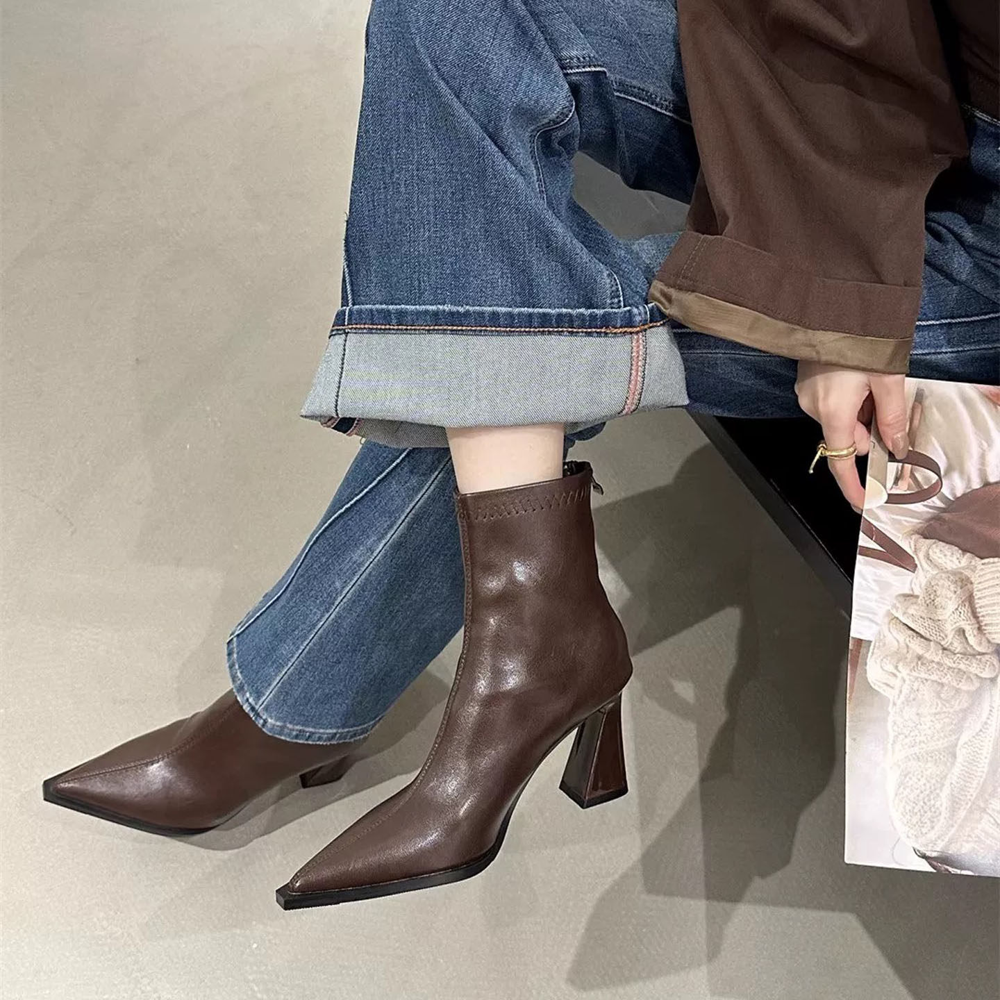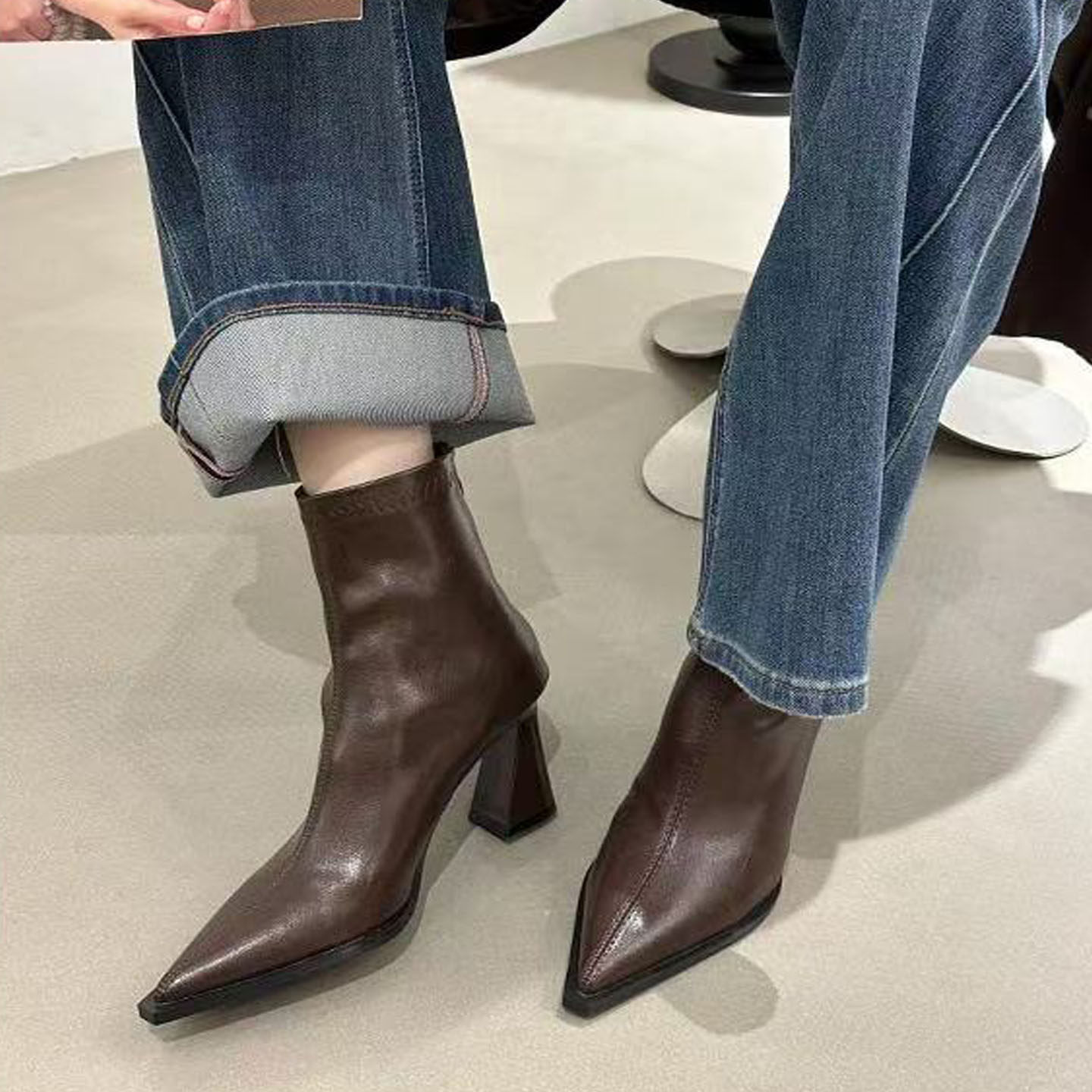 靴 后拉链瘦瘦靴百搭气质通勤时装 法式 高跟尖头粗跟短靴女2025新款
