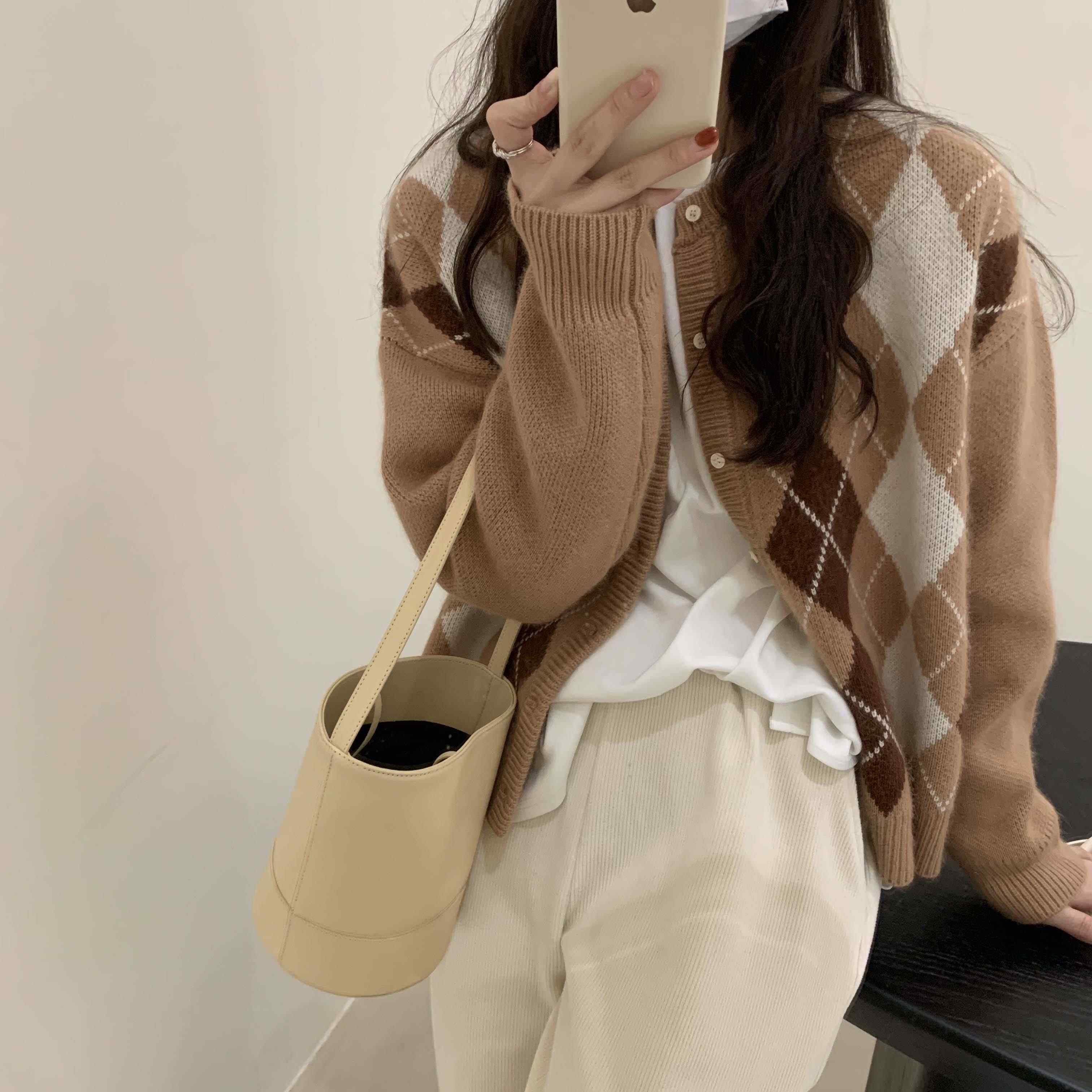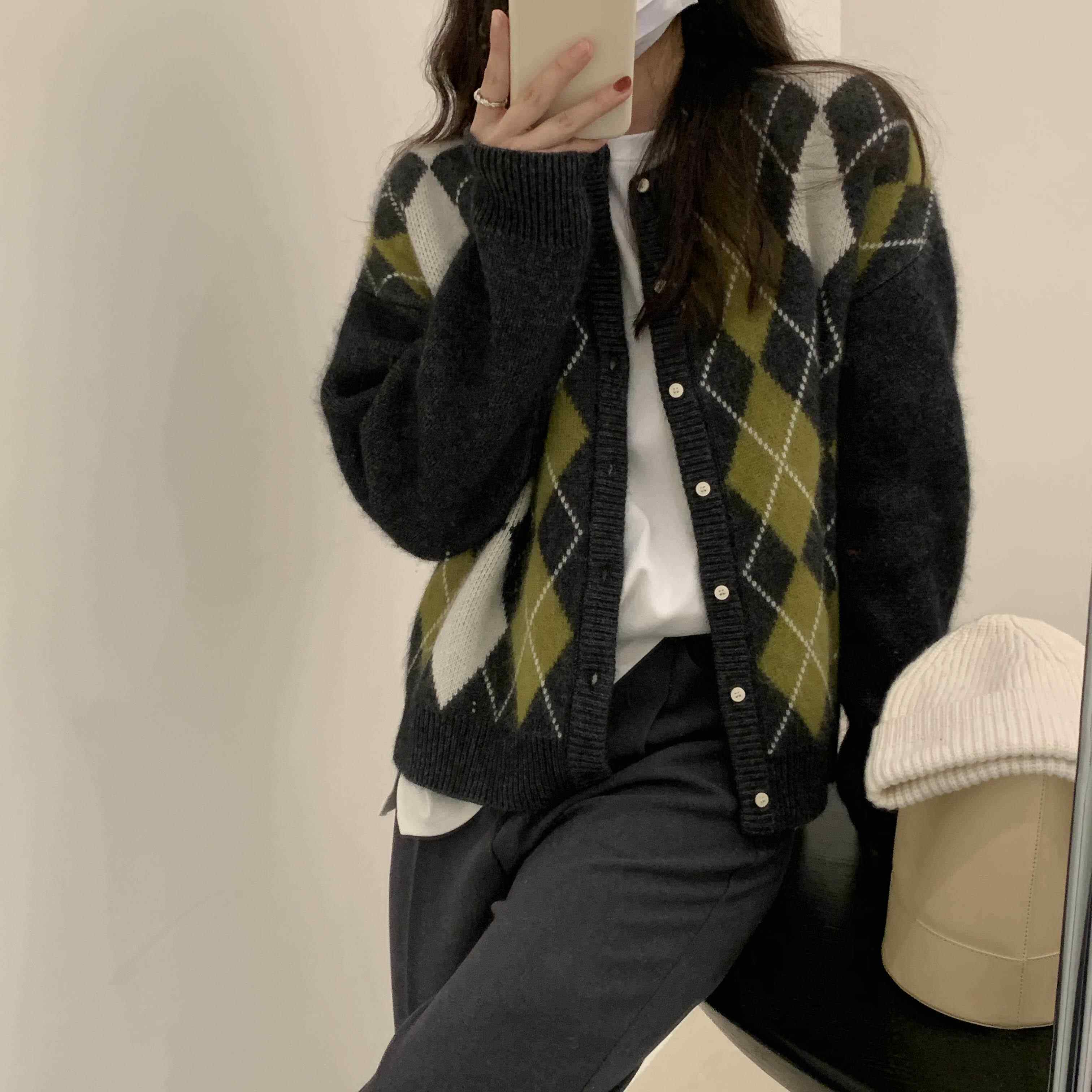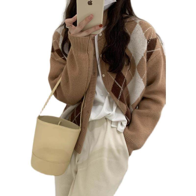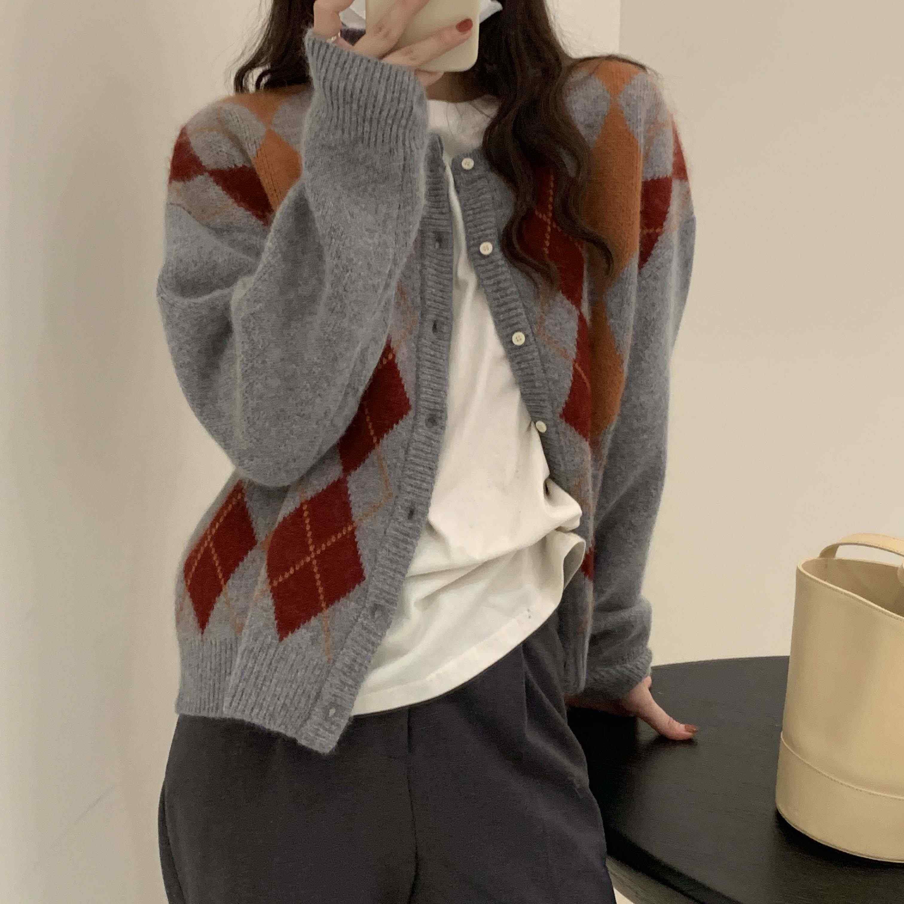 日系纯色菱格针织开衫 学生复古慵懒浣熊绒毛衣 外套女2022秋冬新款