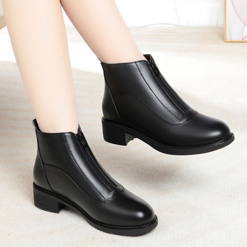 短筒靴 中筒靴子加绒女士真皮平底女雪地靴中老年妈妈棉鞋 冬季 女鞋