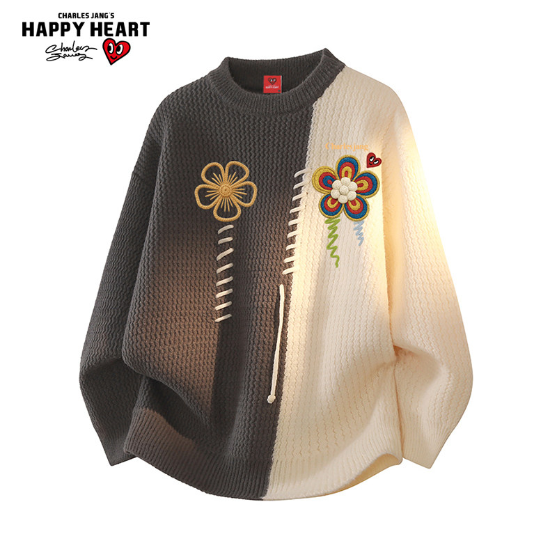 查尔斯桃心撞色拼接圆领毛衣男女花卉印花冬季 加厚保暖针织上衣