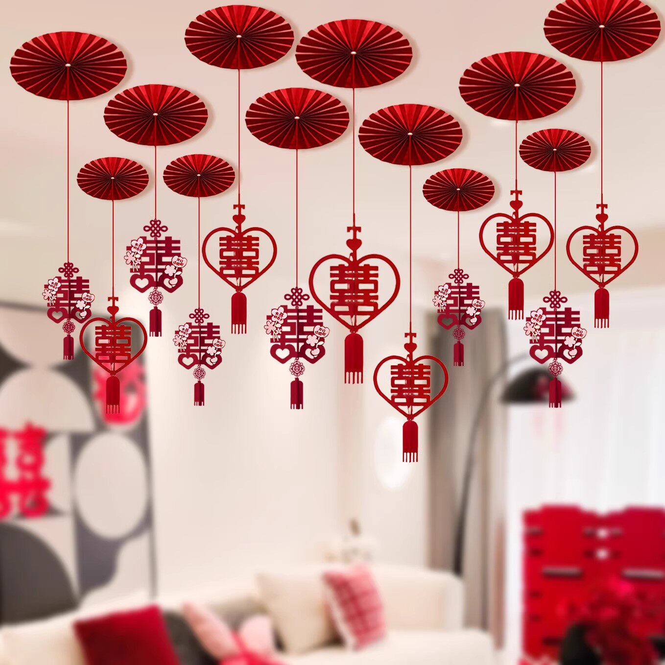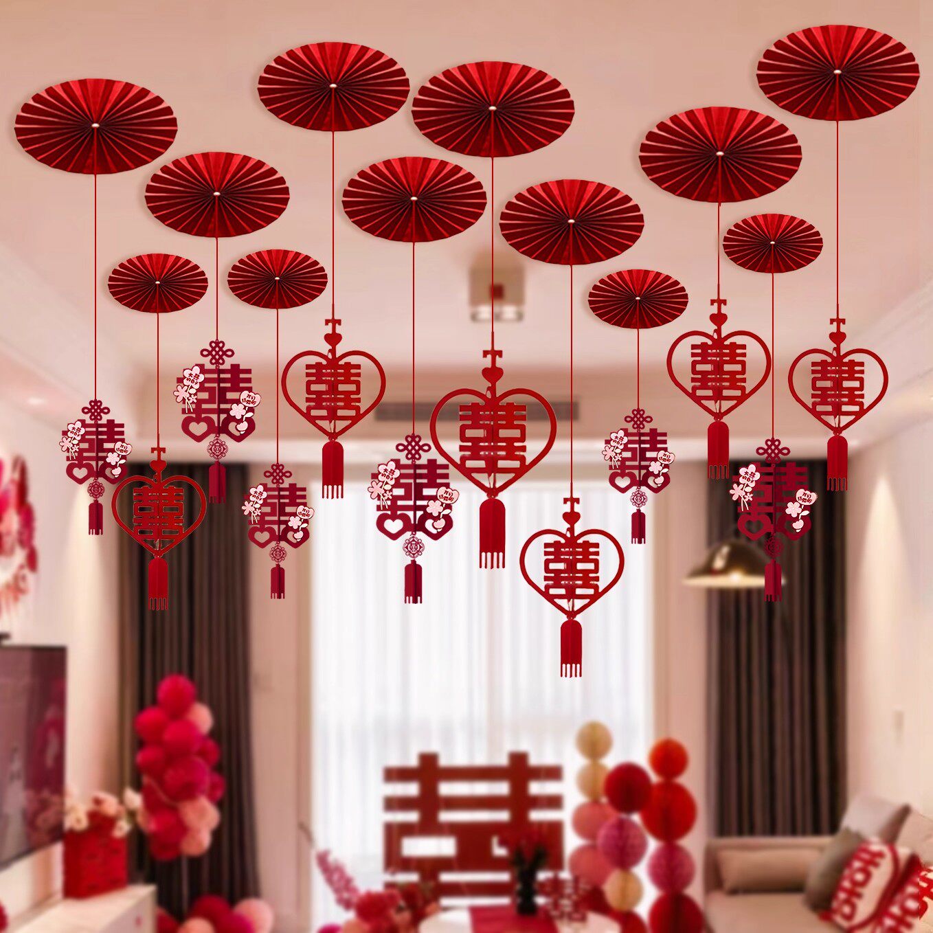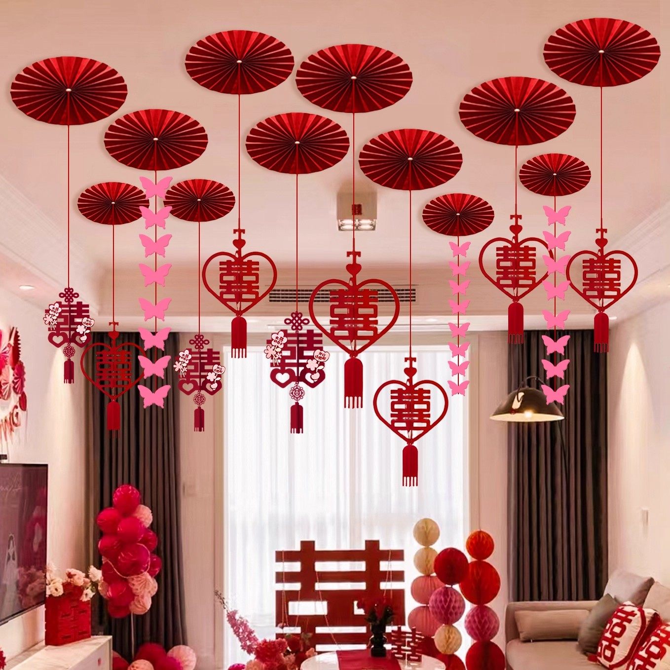 婚房拉花吊顶布置装 饰喜字结婚礼男女方客厅扇花挂饰用品房顶卧室