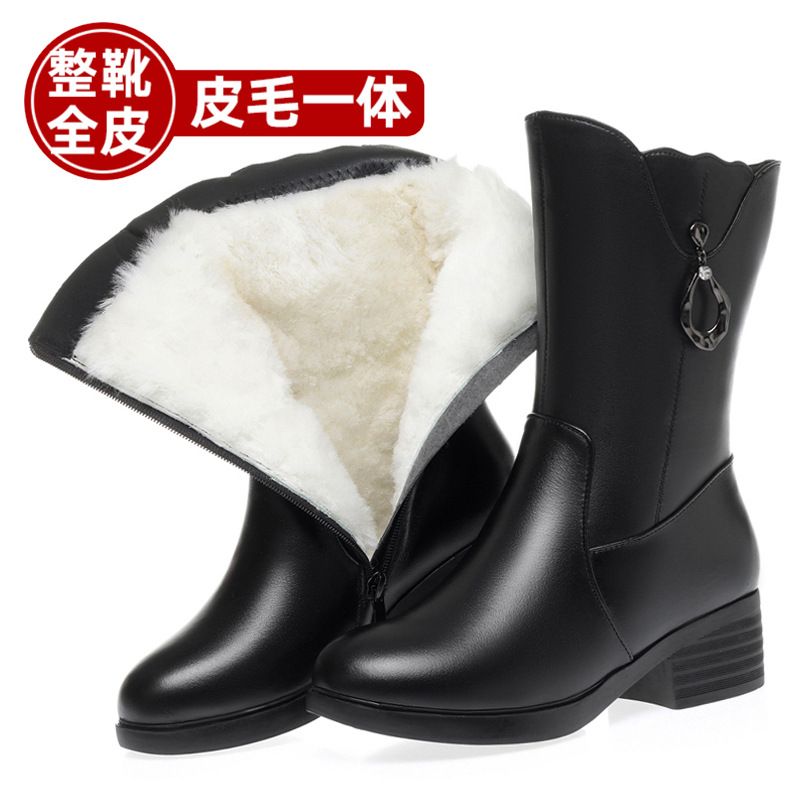 中筒靴女冬加绒加厚羊毛靴子中跟全牛皮女棉靴皮毛一体雪地靴大码