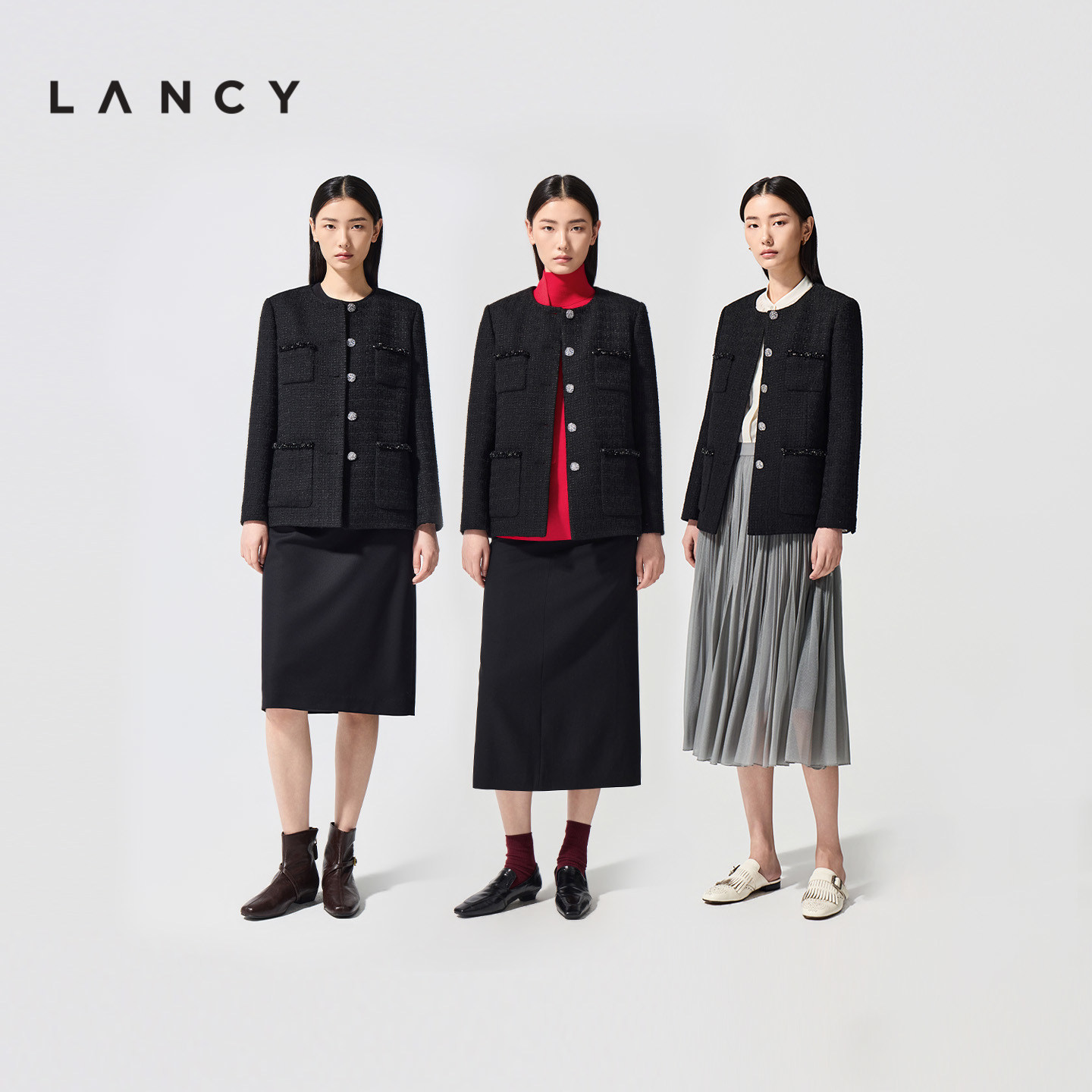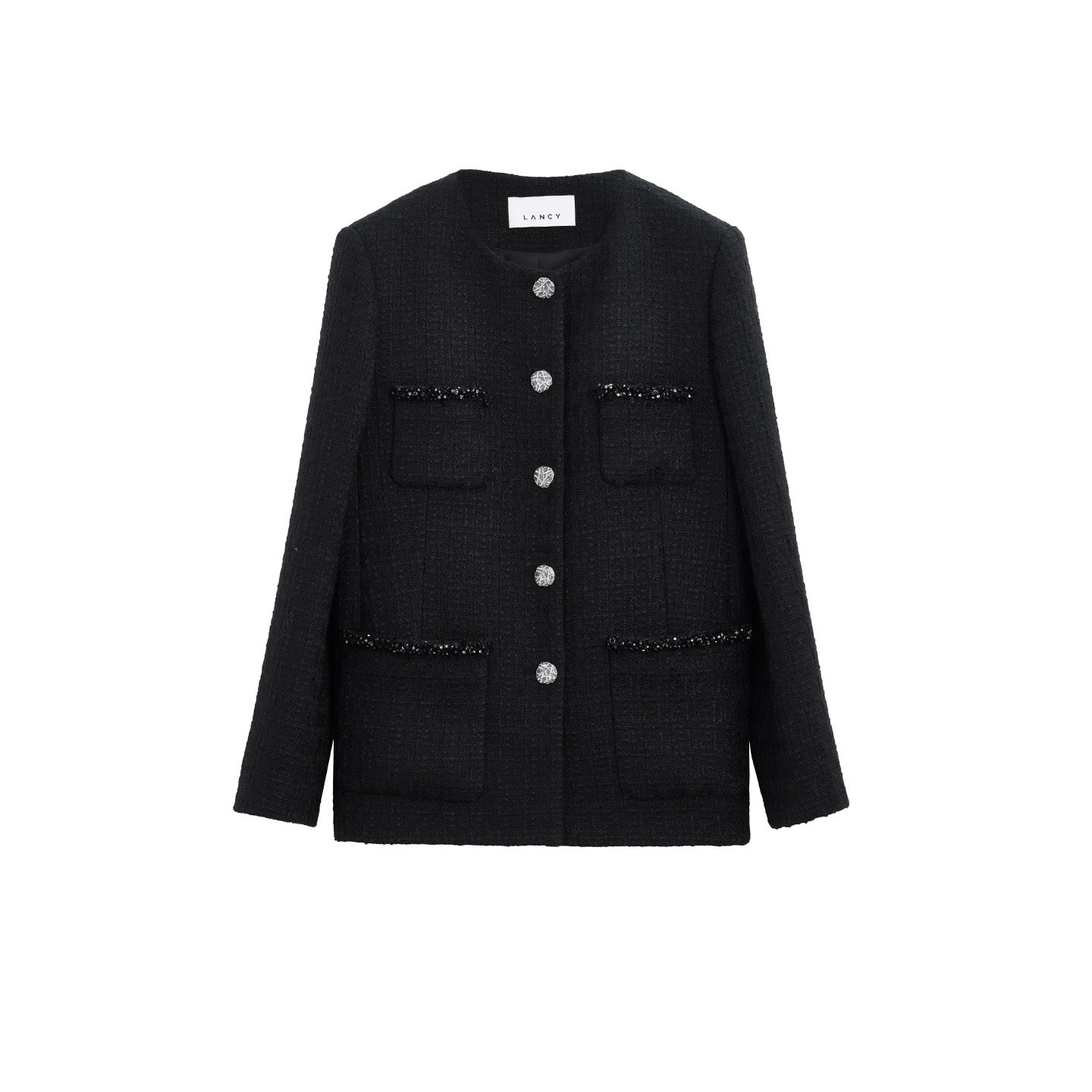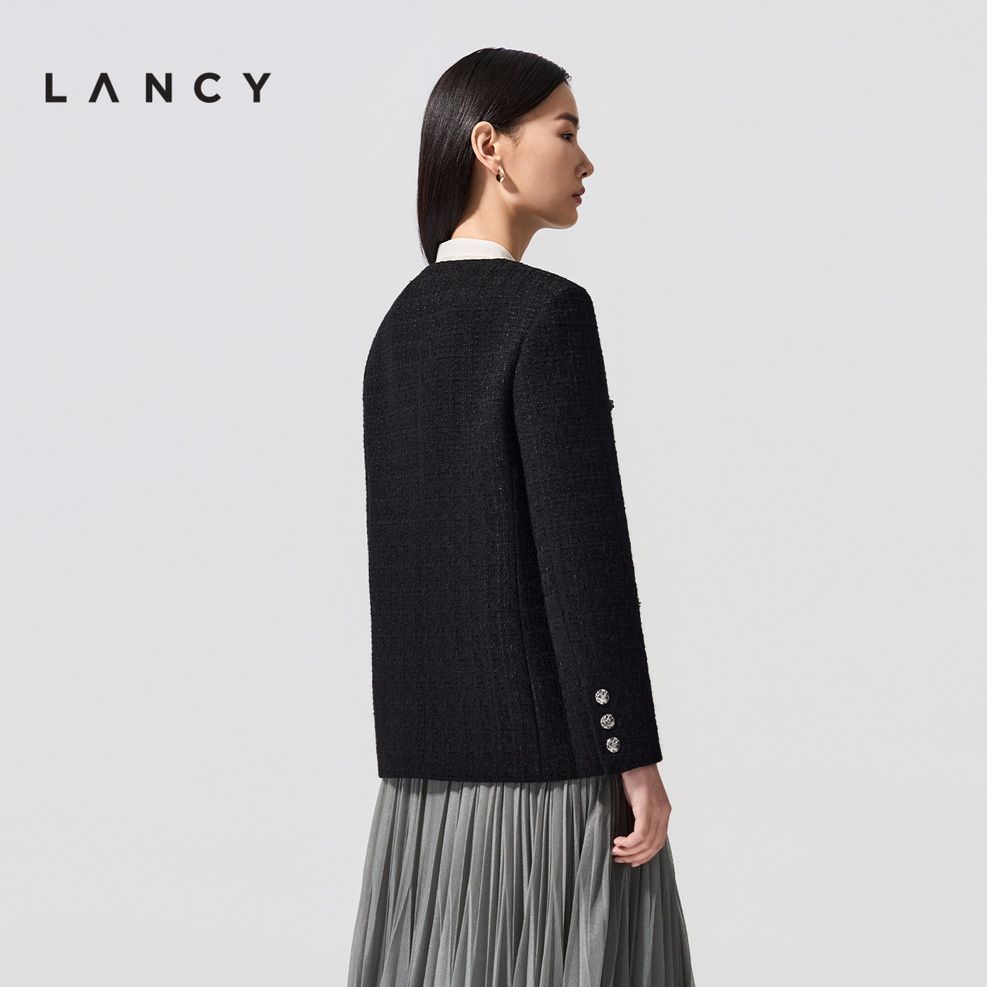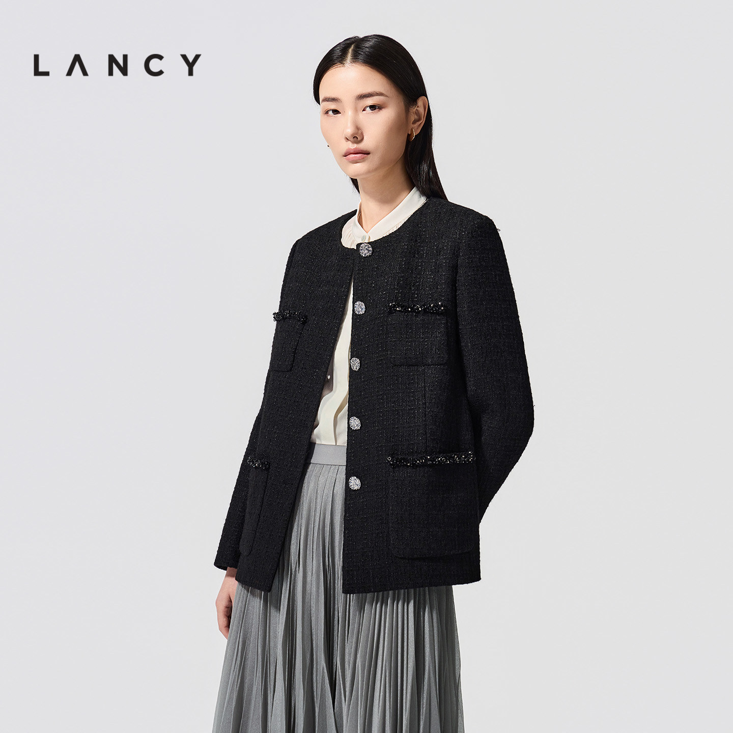 小香风粗花呢短外套女圆领钉珠黑色上衣 法式 LANCY 朗姿2026春新款