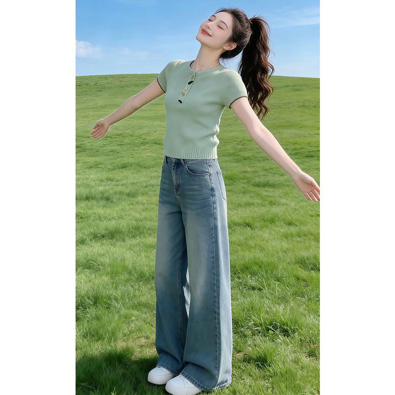 韩系今年流行简约百搭洋气针织衫 上衣 小众套头设计感2026春夏短袖