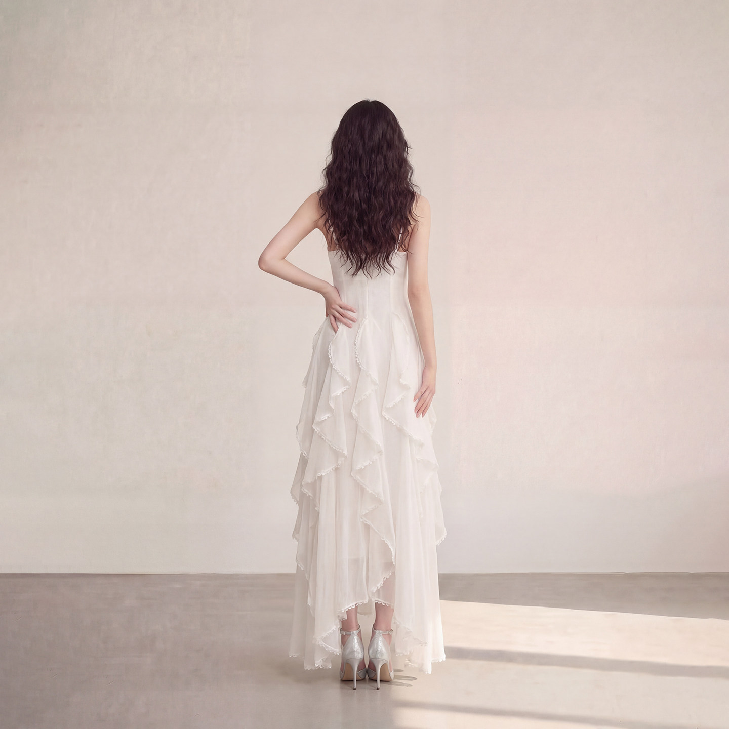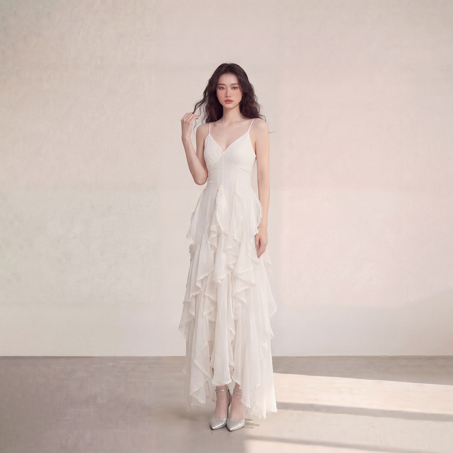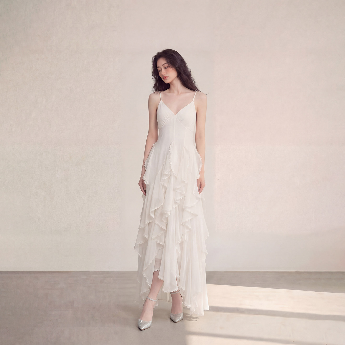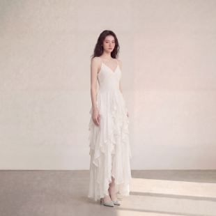 艾格法式 仙女白色吊带连衣裙温柔风V领荷叶边收腰显瘦不规则A字裙