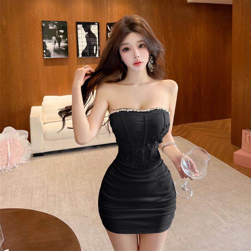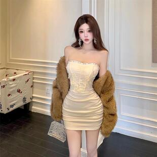 纯欲风设计感提花镶钻抹胸连衣裙性感包臀褶皱修身 显瘦生日礼服裙