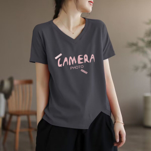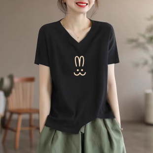 t恤女韩版 100纯棉短袖 夏季 新款 减龄V领全棉百搭上衣 断码 时尚 清仓
