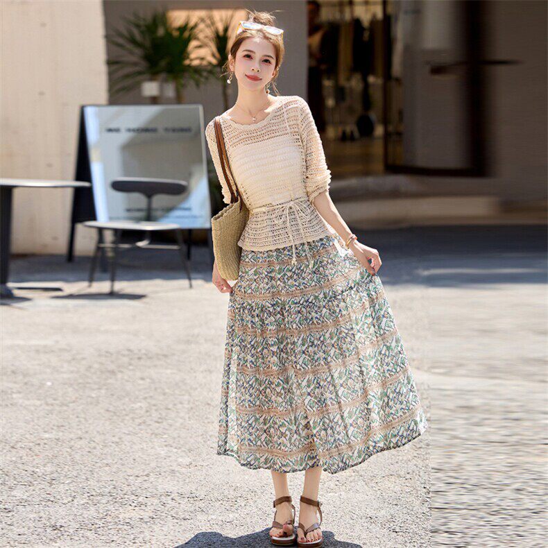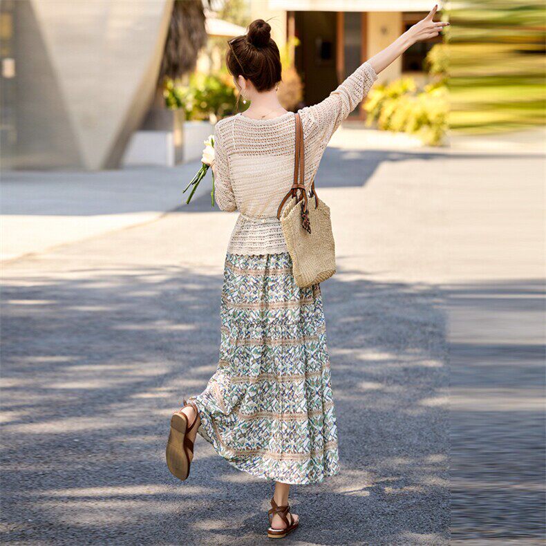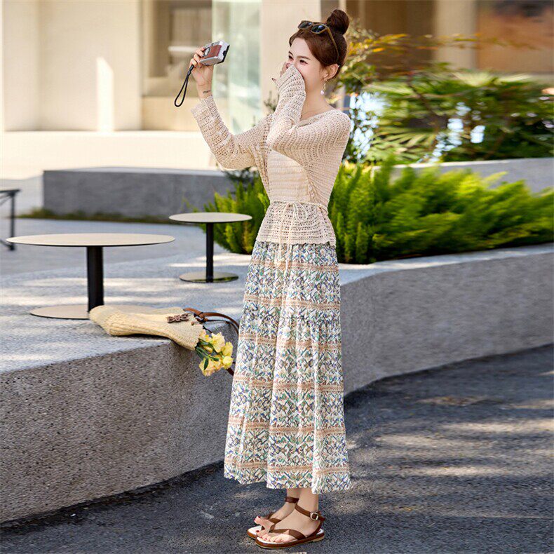 波西米亚风镂空针织衫 碎花半身裙三件套女夏减龄度假风套装